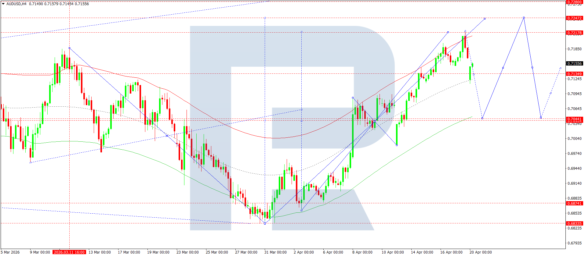 AUDUSD juftligining H4 grafikida bozor 0.7166 atrofida konsolidatsiya diapazonini shakllantirdi. Bugun, 20 aprel 2026, pastga yorib o‘tilsa, 0.7044 gacha pasayish davom etadi. Keyinchalik 0.7140 gacha o‘sish kutilmoqda.