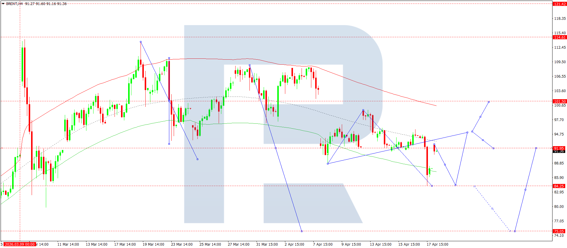 Brent neftining H4 grafikida bozor 84.25 darajasigacha pasayish strukturasini yakunladi. Bugun, 20 aprel 2026, 92.00 gacha o‘sish kutilmoqda va shu darajadan pastda konsolidatsiya shakllanishi mumkin. Agar yuqoriga yorib o‘tilsa, 101.50 va 110.00 gacha o‘sish ehtimoli mavjud. Aks holda, pastga yorib o‘tilsa, 75.00 gacha tuzatish bo‘lishi mumkin, undan keyin yana 110.00 tomon o‘sish kutiladi.