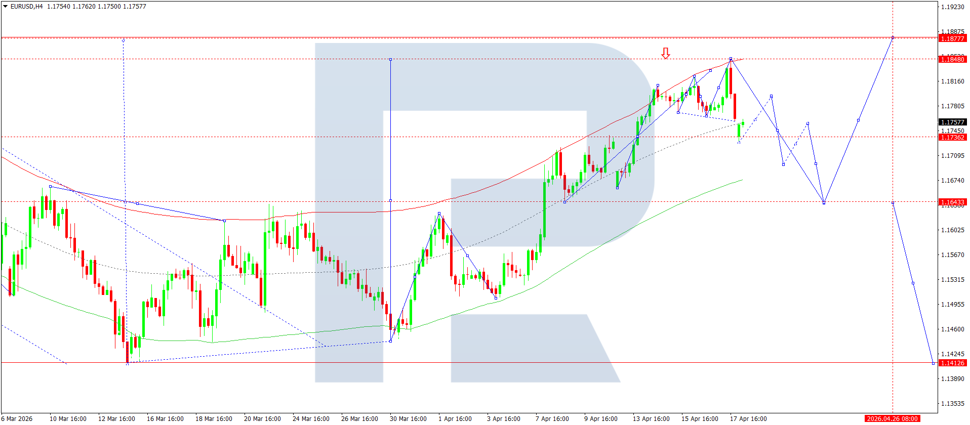 EURUSD juftligining H4 grafikida bozor 1.1800 atrofida konsolidatsiya diapazonini shakllantirib, uni pastga yorib o‘tdi. Bugun, 20 aprel 2026, 1.1730 gacha pasayish to‘lqini yakunlandi. Endi 1.1760 gacha o‘sish kutilmoqda. Keyinchalik, agar 1.1730 pastga yorib o‘tilsa, 1.1690 gacha pasayish ehtimoli ochiladi va trend 1.1643 gacha davom etishi mumkin.