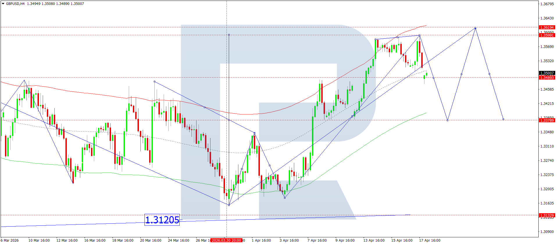 GBPUSD juftligining H4 grafikida bozor 1.3555 atrofida konsolidatsiyani davom ettirmoqda. Bugun, 20 aprel 2026, narx pastga yorib o‘tishi kutilmoqda, bu esa 1.3380 va ehtimol 1.3340 gacha pasayish imkonini beradi.