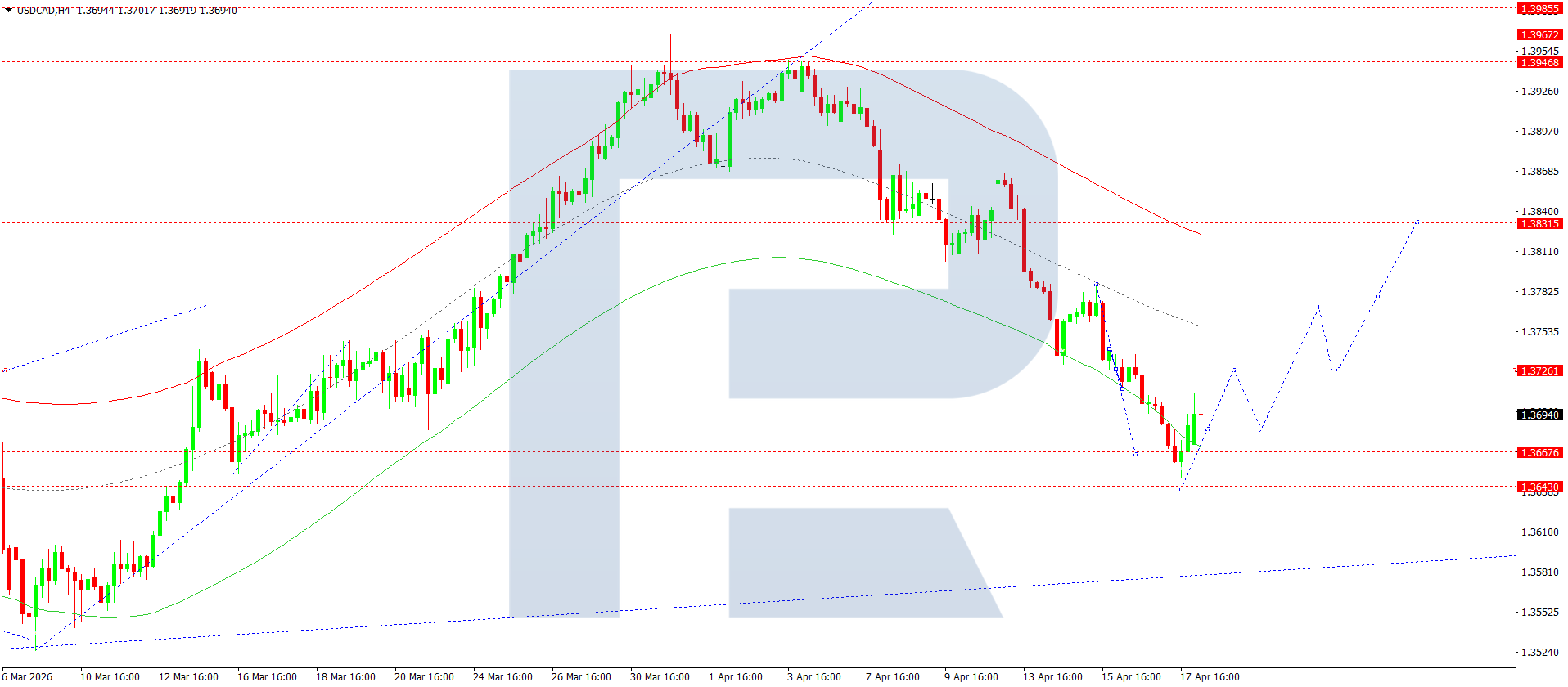 USDCAD juftligining H4 grafikida bozor 1.3746 gacha pasayish strukturasini yakunladi. Bugun, 20 aprel 2026, ushbu darajadan yuqorida konsolidatsiya shakllandi. Yuqoriga yorib o‘tilsa, 1.3727 tomon harakat boshlanadi. Keyinchalik 1.3688 gacha pasayish va undan so‘ng 1.3770 hamda 1.3830 gacha o‘sish kutilmoqda.