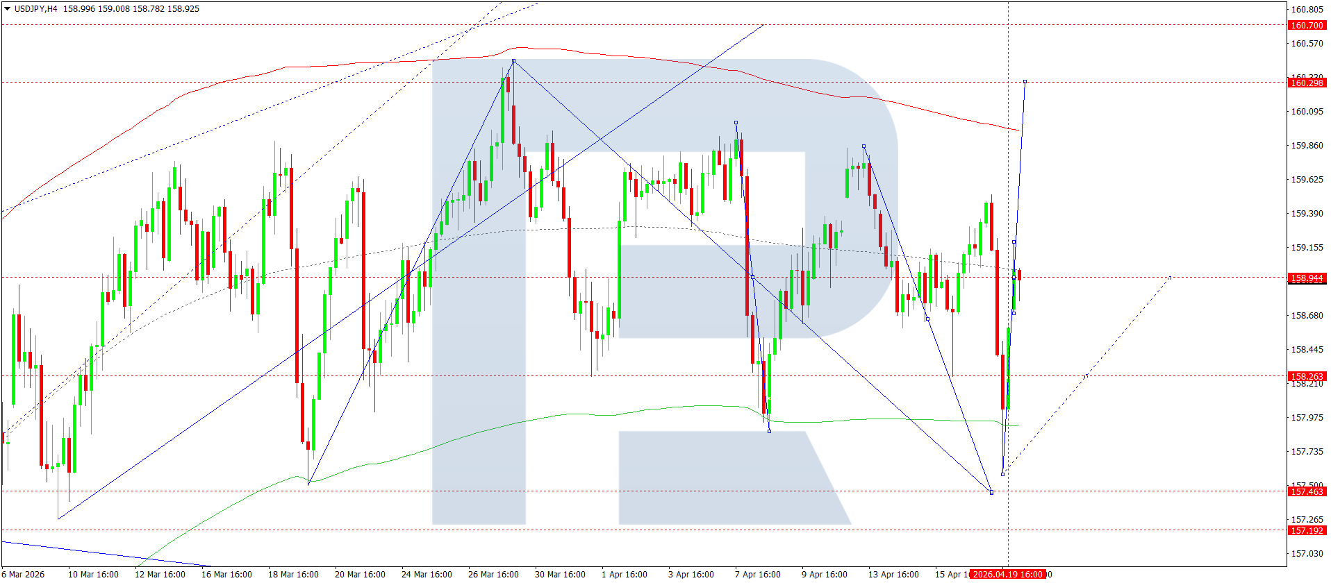 USDJPY juftligining H4 grafikida bozor 157.57 gacha pasayish to‘lqinini yakunlab, 159.18 gacha o‘sdi. Bugun, 20 aprel 2026, 158.90 atrofida konsolidatsiya shakllanmoqda va keyinchalik 160.30 gacha o‘sish ehtimoli mavjud. So‘ng 158.90 gacha pasayish kutiladi.
