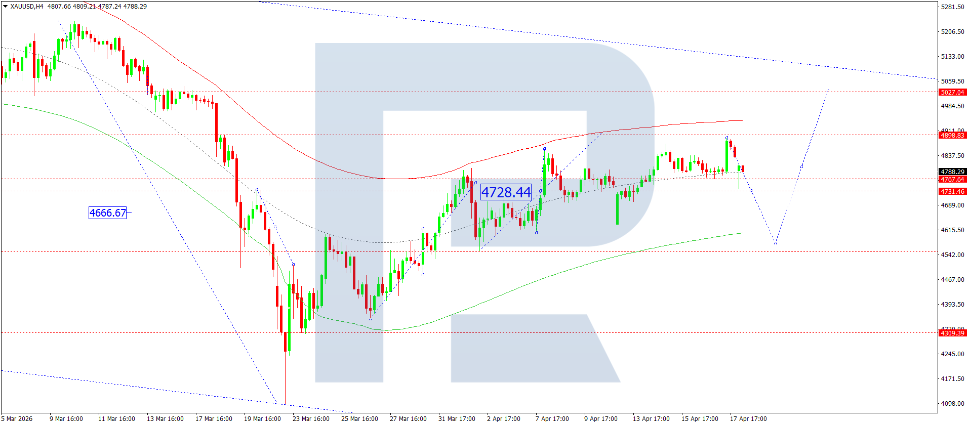 XAUUSD H4 grafikida bozor 4,800 atrofida konsolidatsiya shakllantirmoqda. Bugun, 20 aprel 2026, 4,545 gacha pasayish kutilmoqda, undan so‘ng 4,737 gacha o‘sish ehtimoli mavjud.