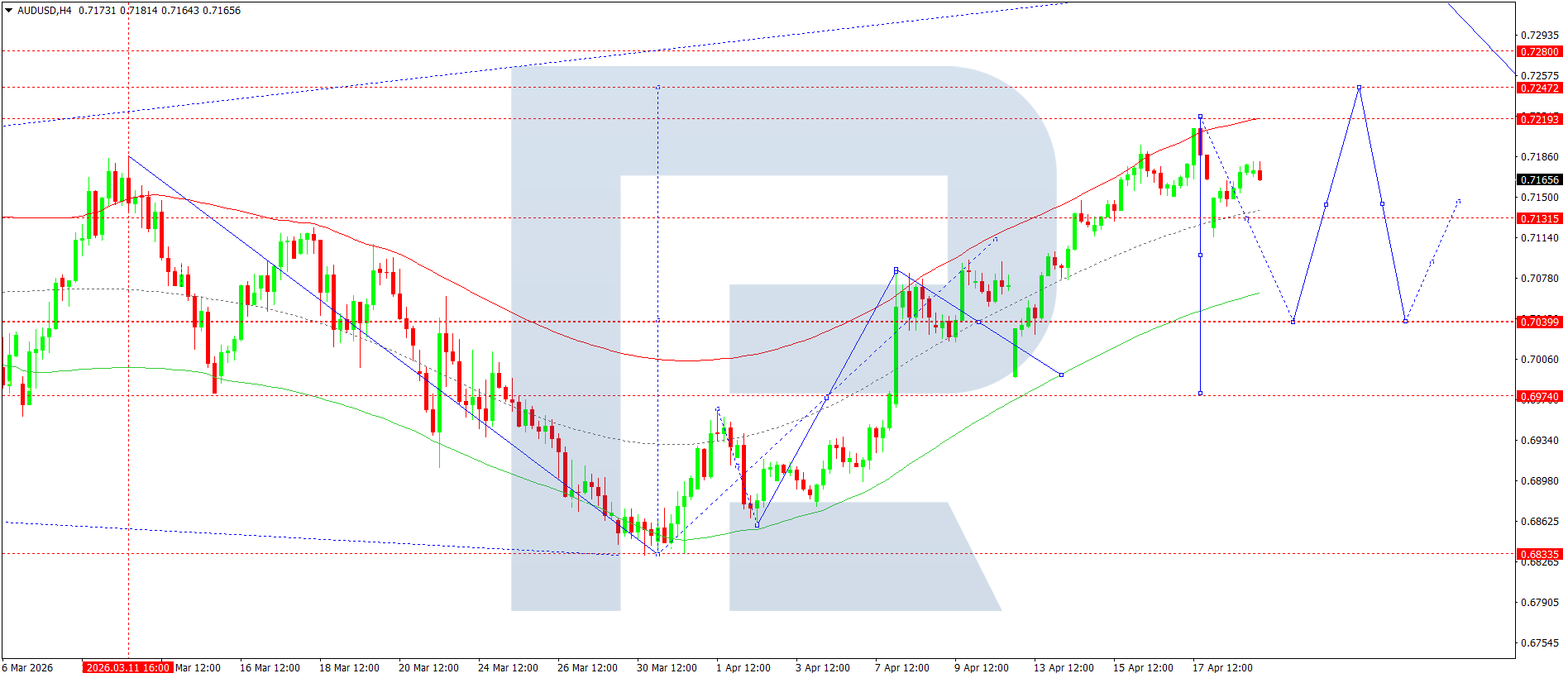 AUDUSD juftligining H4 grafikida bozor 0.7179 atrofida konsolidatsiya diapazonini shakllantirdi. Bugun, 21 aprel 2026, pastga yorib o‘tilsa, 0.7131 gacha pasayish va undan keyin 0.7080 gacha davom etish ehtimoli mavjud.