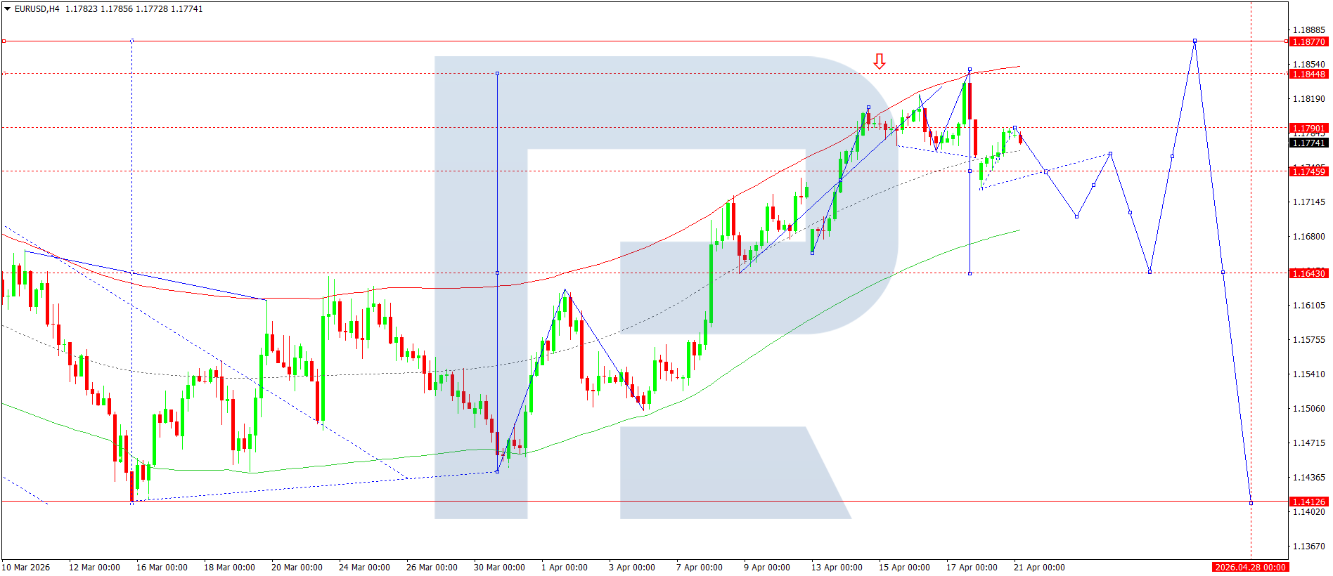 EURUSD juftligining H4 grafikida bozor 1.1790 darajasigacha tuzatishni yakunladi. Bugun, 21 aprel 2026, 1.1745 gacha pasayish to‘lqini kutilmoqda. Ushbu daraja pastga yorib o‘tilsa, 1.1700 tomon harakat davom etishi mumkin. Keyinchalik 1.1755 gacha o‘sish ehtimoli mavjud. So‘ngra 1.1677 gacha pasayish va undan keyin 1.1645 gacha davom etish ehtimoli bor.