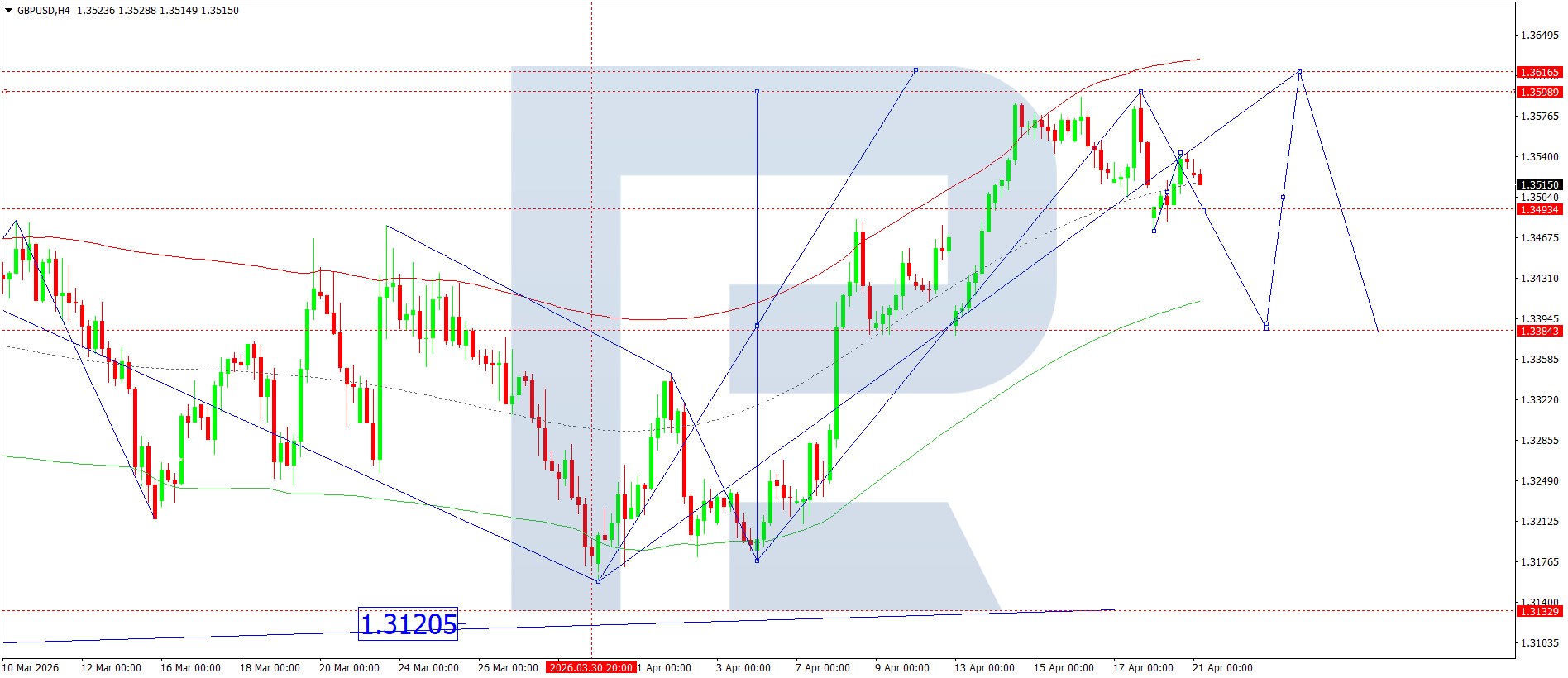 GBPUSD juftligining H4 grafikida bozor 1.3500 atrofida konsolidatsiyani davom ettirmoqda. Bugun, 21 aprel 2026, narx pastga yorib o‘tishi kutilmoqda, bu esa 1.3440 va ehtimol 1.3380 gacha pasayish imkonini beradi.