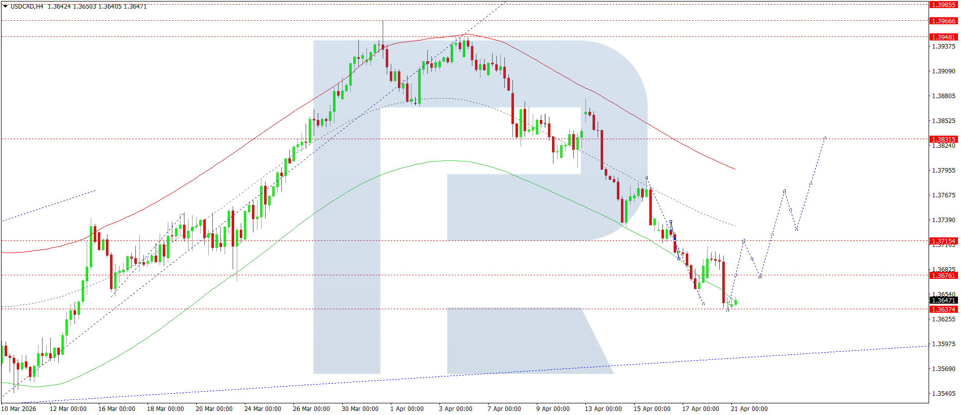 USDCAD juftligining H4 grafikida bozor 1.3636 gacha pasayish strukturasini yakunladi. Bugun, 21 aprel 2026, ushbu darajadan yuqorida konsolidatsiya shakllangan. Agar yuqoriga yorib o‘tilsa, 1.3717 tomon o‘sish boshlanadi. Keyinchalik 1.3688 gacha pasayish va undan so‘ng 1.3770 hamda 1.3830 gacha o‘sish ehtimoli mavjud.