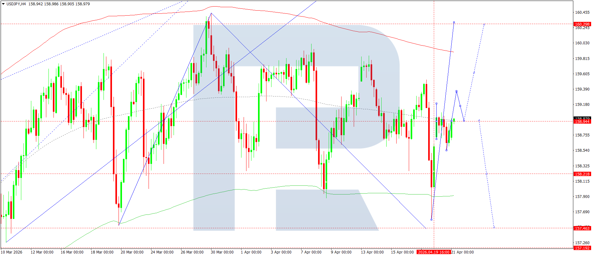 USDJPY juftligining H4 grafikida bozor 158.54 gacha pasayish to‘lqinini yakunlab, 158.98 gacha o‘sdi. Bugun, 21 aprel 2026, ushbu daraja atrofida konsolidatsiya shakllanmoqda. Keyinchalik 159.50 tomon o‘sish ehtimoli mavjud. So‘ngra 158.95 gacha pasayish va undan keyin 160.30 gacha yana o‘sish kutilmoqda.