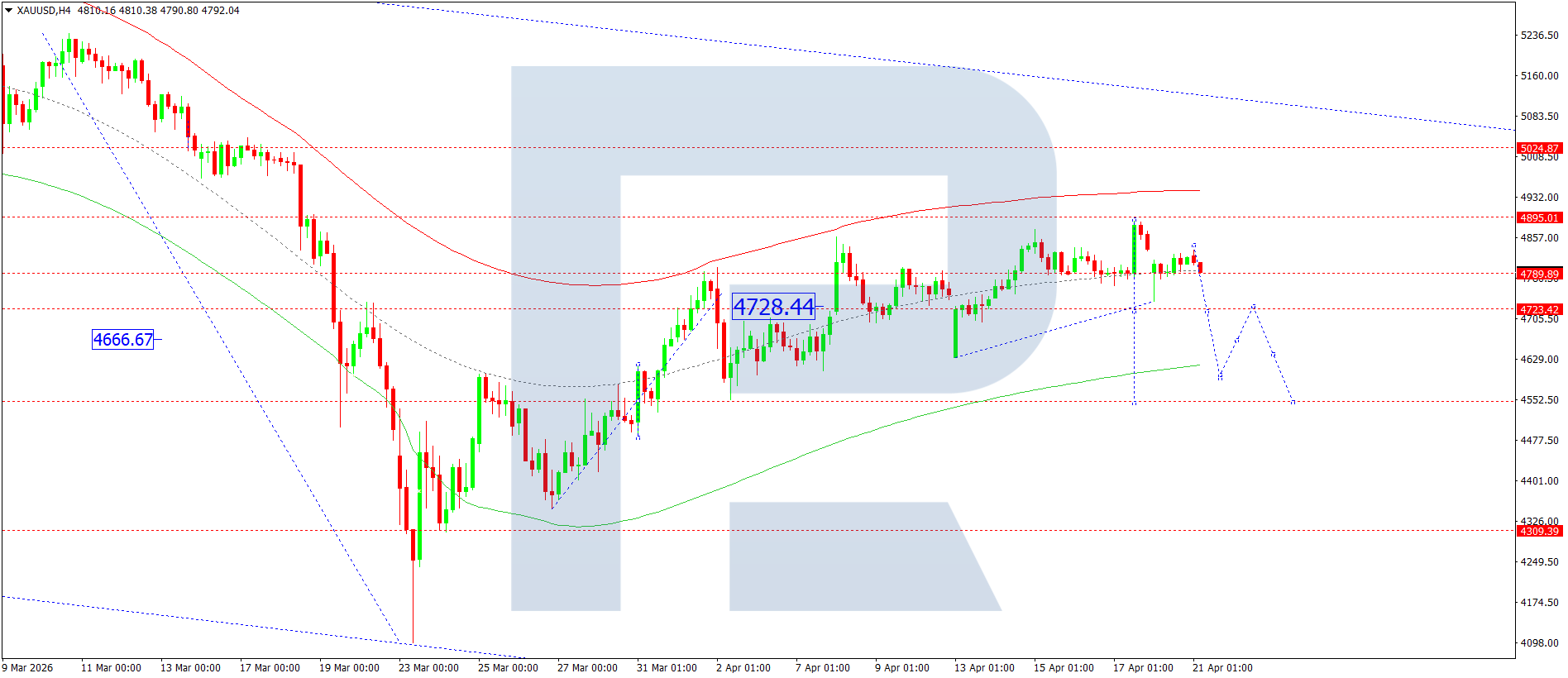 XAUUSD H4 grafikida bozor 4,789 atrofida konsolidatsiya shakllantirmoqda. Bugun, 21 aprel 2026, 4,555 gacha pasayish kutilmoqda, undan keyin 4,727 gacha o‘sish ehtimoli mavjud.