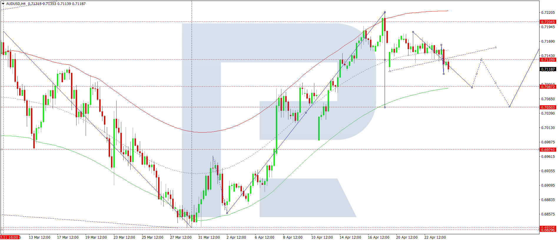 AUDUSD juftligining H4 grafikida bozor 0.7135 atrofida konsolidatsiya diapazonini shakllantirdi. Bugun, 24 aprel 2026, pastga yorib o‘tilsa, 0.7082 gacha pasayish va undan keyin 0.7050 gacha davom etish ehtimoli mavjud.