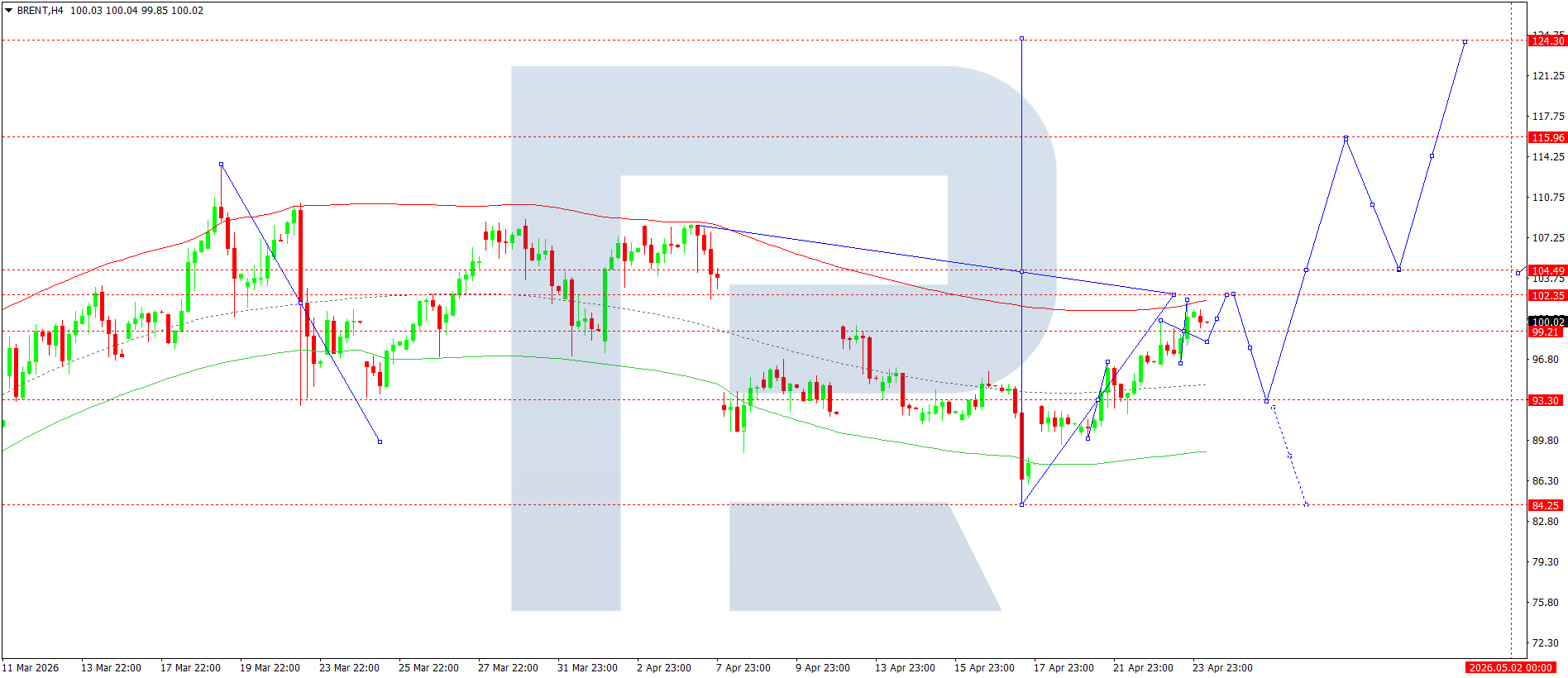 Brent neftining H4 grafikida bozor 101.89 gacha o‘sib, 99.49 gacha pasaydi. Bugun, 24 aprel 2026, 102.60 gacha o‘sish ehtimoli mavjud va ushbu darajadan pastda konsolidatsiya shakllanishi mumkin. Agar yuqoriga yorib o‘tilsa, 115.96 va 124.30 gacha o‘sish ehtimoli mavjud. Aks holda, pastga yorib o‘tilsa, 93.30 tomon tuzatish kuzatilishi mumkin.