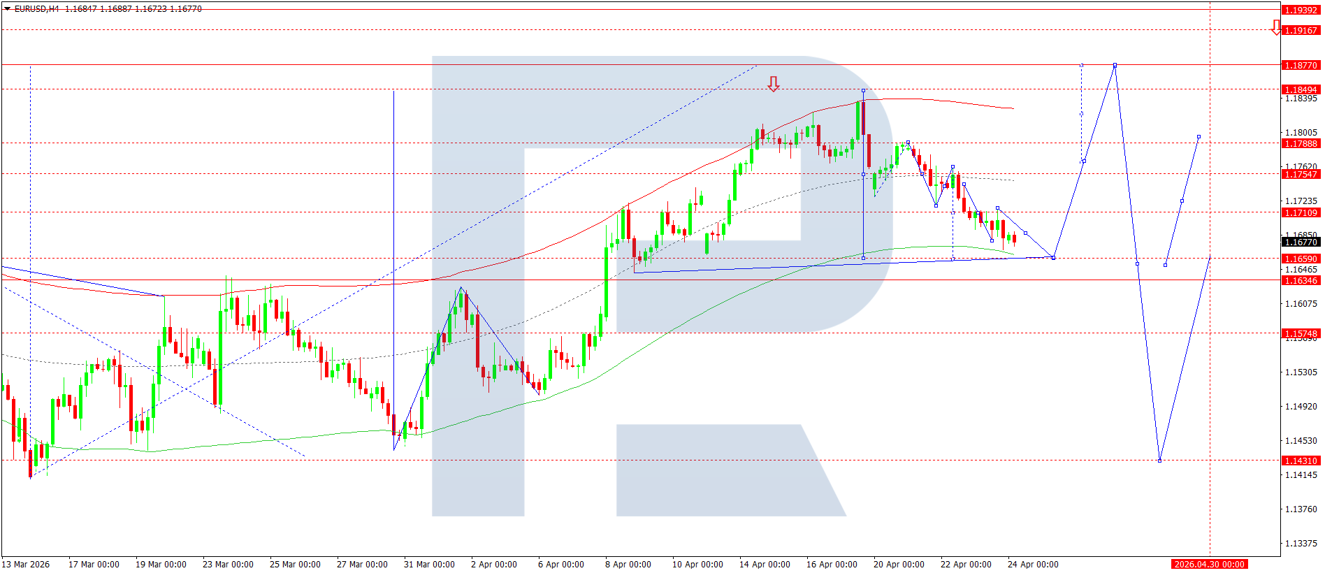 EURUSD juftligining H4 grafikida bozor 1.1710 darajasidan pastga yorib o‘tib, 1.1659 tomon harakatni davom ettirmoqda, bu lokal maqsad hisoblanadi. Bugun, 24 aprel 2026, narx ushbu darajaga yetishi kutilmoqda va uning atrofida konsolidatsiya shakllanadi. Agar pastga yorib o‘tilsa, 1.1626 tomon pasayish davom etadi. Keyinchalik 1.1760 gacha o‘sish ehtimoli ham mavjud.