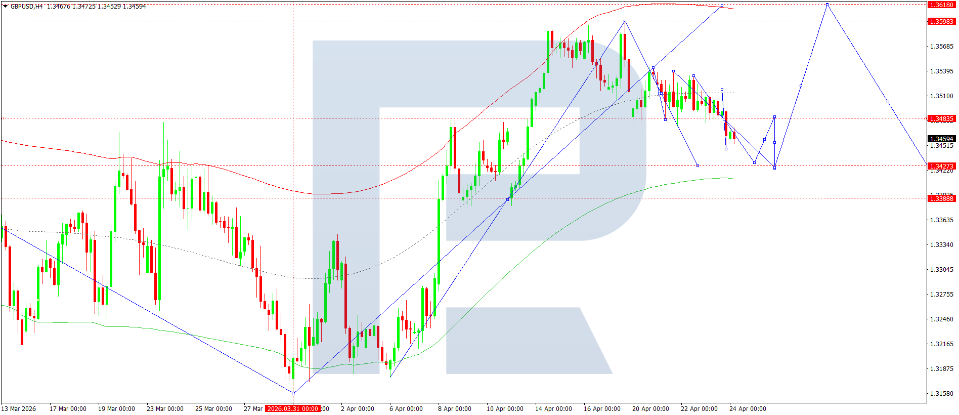 GBPUSD juftligining H4 grafikida bozor 1.3485 atrofida konsolidatsiyani davom ettirmoqda. Bugun, 24 aprel 2026, narx pastga yorib o‘tishi kutilmoqda, bu esa 1.3427 va keyin 1.3388 gacha pasayish imkonini beradi.