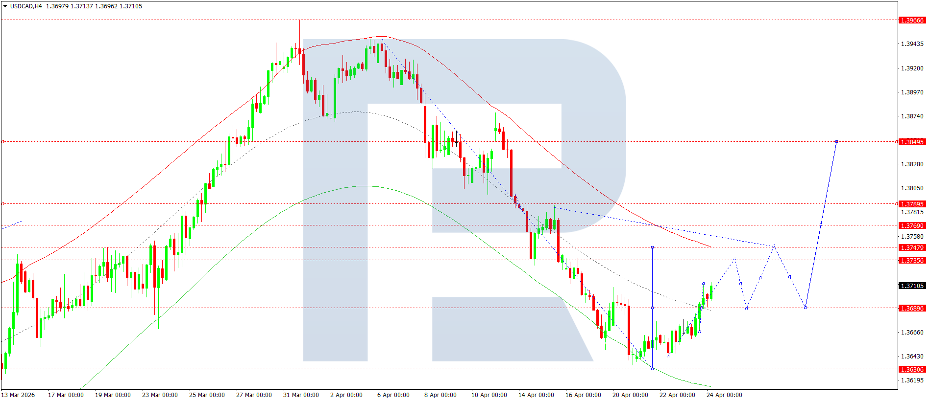 USDCAD juftligining H4 grafikida bozor 1.3686 darajasigacha pasayish strukturasini yakunladi. Bugun, 24 aprel 2026, ushbu darajadan yuqorida konsolidatsiya shakllangan. Agar yuqoriga yorib o‘tilsa, 1.3735 tomon o‘sish boshlanadi. Keyinchalik 1.3686 gacha pasayish va undan so‘ng 1.3750 hamda 1.3789 gacha o‘sish ehtimoli mavjud.