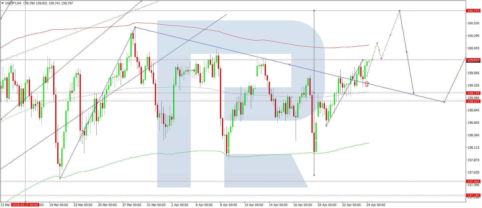 USDJPY juftligining H4 grafikida bozor 159.50 darajasida qo‘llab-quvvatlash topdi. Bugun, 24 aprel 2026, ushbu darajadan pastda konsolidatsiya shakllanmoqda. 160.15 tomon o‘sish ehtimoli mavjud. Keyinchalik 159.80 gacha pasayish va undan so‘ng 160.77 gacha yana o‘sish kutilmoqda.
