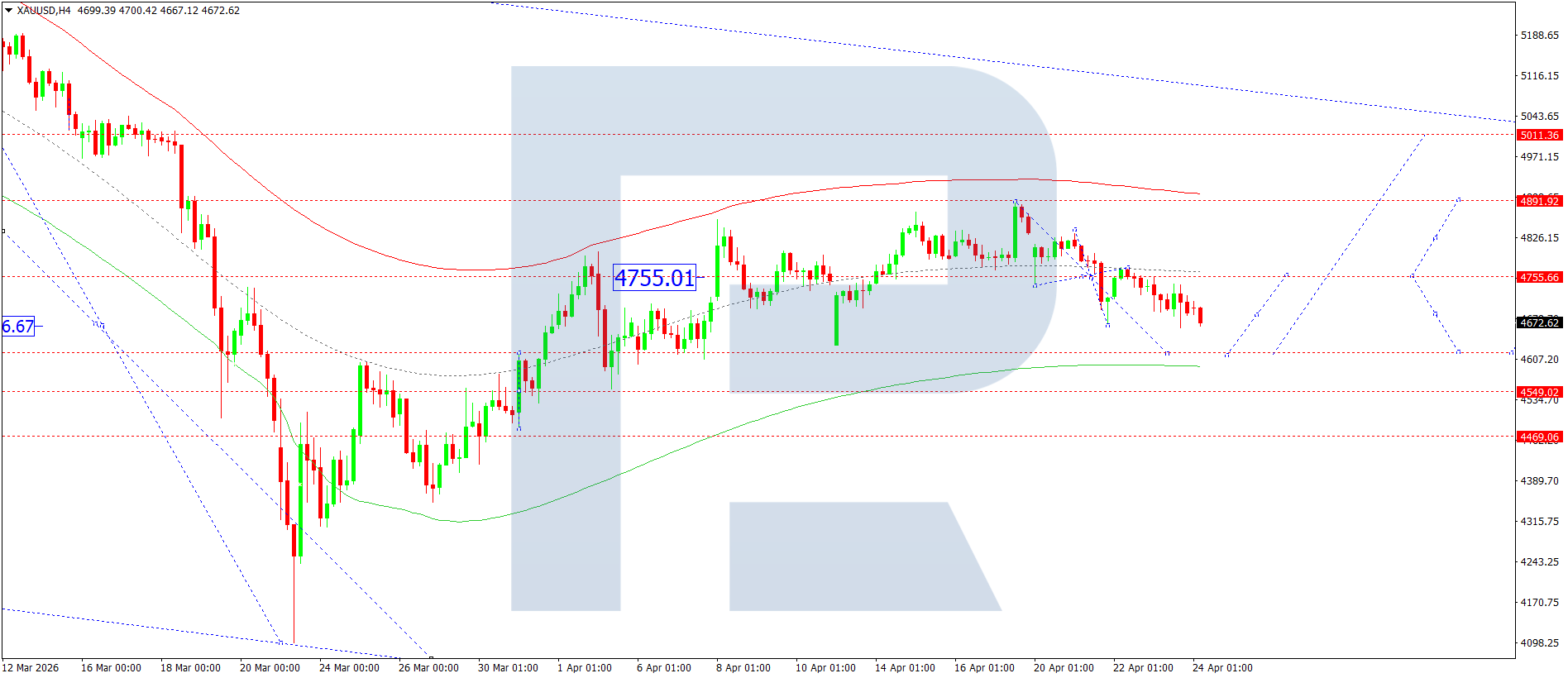 XAUUSD H4 grafikida bozor 4,755 atrofida konsolidatsiya shakllantirmoqda. Bugun, 24 aprel 2026, narx 4,616 gacha pasayishi kutilmoqda. Keyinchalik 4,755 gacha o‘sish ehtimoli mavjud.
