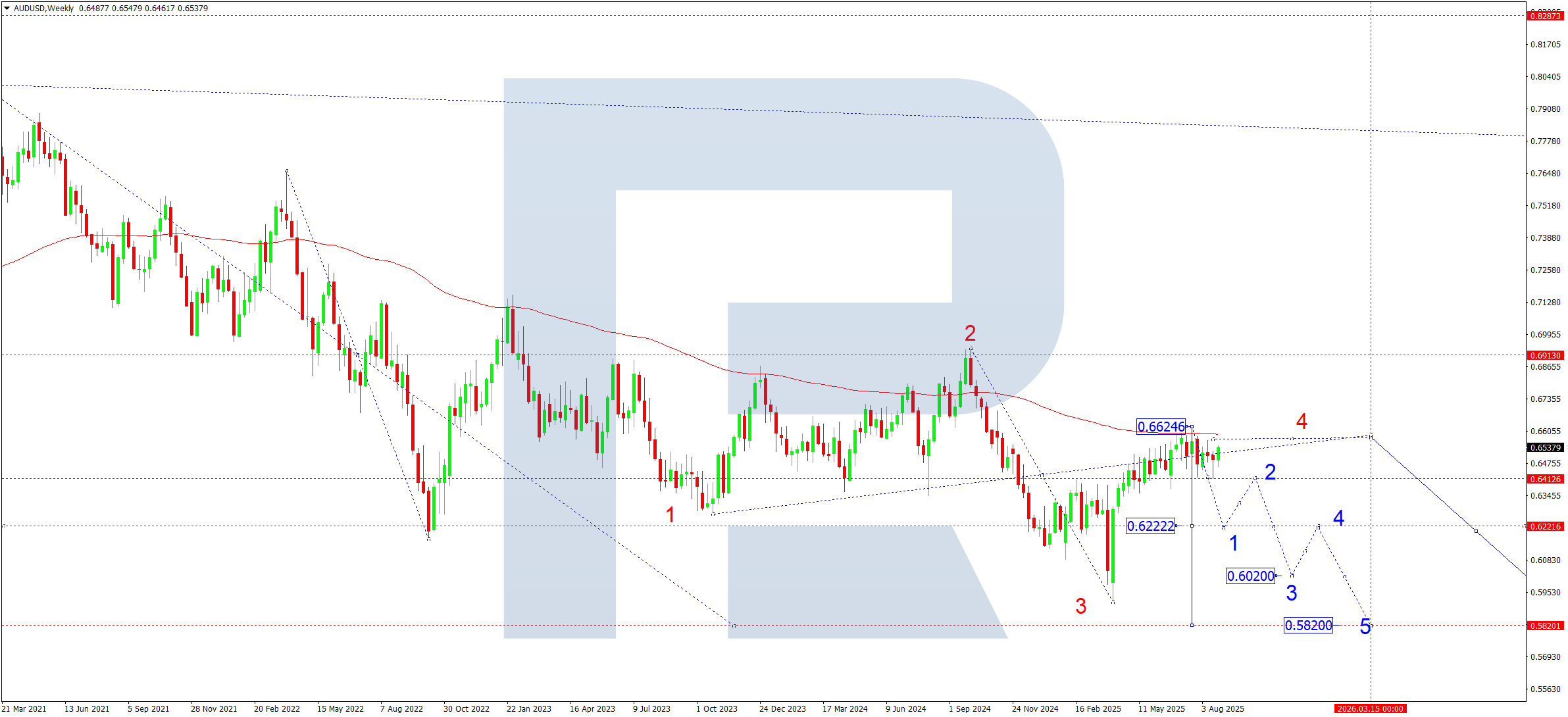 Haftalik grafikda AUDUSD juftligi 0.6624 da tuzatishni yakunladi. Hozir bu daraja ostida konsolidatsiya diapazoni shakllanmoqda. SMA50 o‘sishni kengaytirish urinishlarini to‘xtatmoqda. Sentabrda 0.6410 ostiga yorilib, 0.6222 tomon birinchi maqsadga yo‘l ochilishi ehtimoli yuqori. Biz amalda kengroq pasayish trendidagi yakuniy (beshinchi) pastga to‘lqin boshlanishini 0.5820 tomonga yo‘nalishda ko‘rib turibmiz.