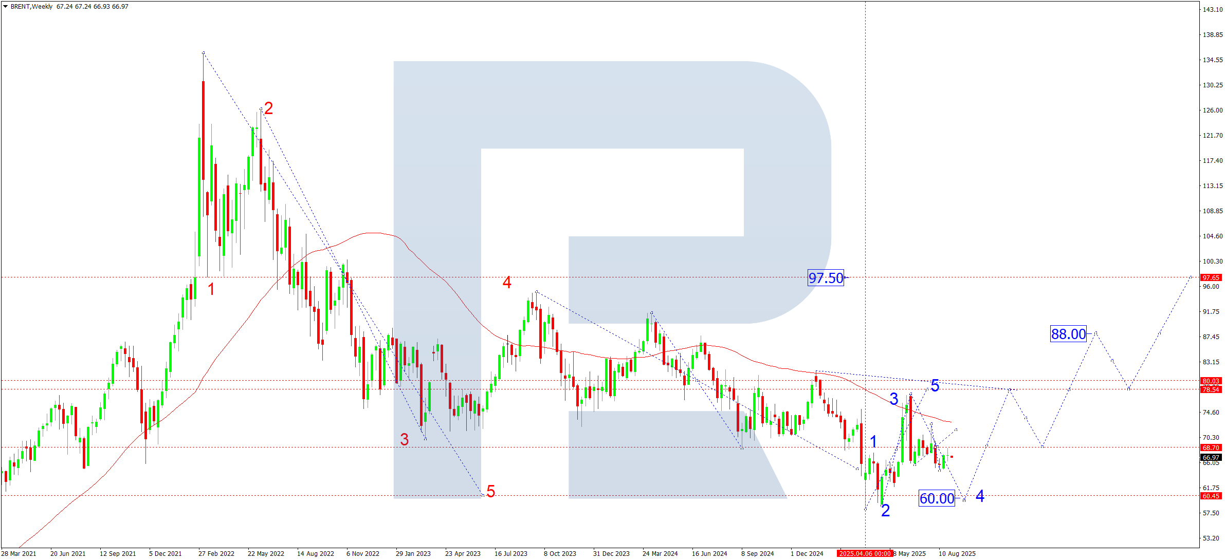 Haftalik grafikda Brent aniq o‘sish to‘lqin tuzilmasini namoyish etmoqda. Birinchi yuqoriga maqsad 78.50 yaqinida. Ushbu darajaga yetgach, 68.70 tomonga tuzatish kutiladi, bu yerda SMA50 qo‘llab-quvvatlashi mumkin. Keyingi ssenariy 88.00 ga uchinchi o‘sish to‘lqinini va 97.50 ga beshinchi to‘lqin potentsialini nazarda tutadi. 68.70 atrofidagi joriy diapazon muhim qarshilik bo‘lib, undan yuqoriga yorilish o‘sish salohiyatini faollashtiradi. Tarixan, ushbu zona ko‘pincha burilishlarni belgilaydi. Tashqi shoklarsiz chuqur pasayish ehtimoli past; biroq 68.70 qo‘llab-quvvatlashidan pastga yorilish 60.00 sinoviga yo‘l qo‘yadi — bu bir nechta eksportchilar uchun rentabellikdan past bo‘lgan psixologik va fundamental pastlik bo‘lib, to‘rtinchi tuzatish to‘lqinini yakunlashi mumkin.
