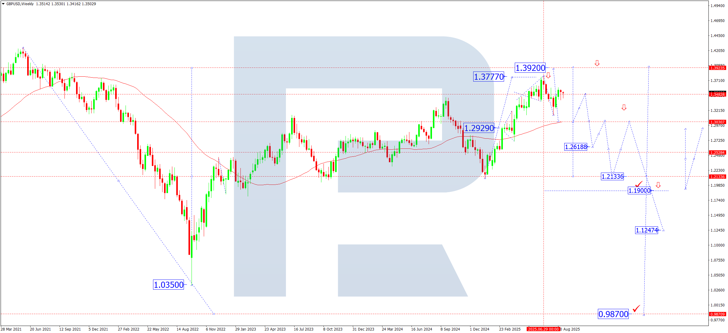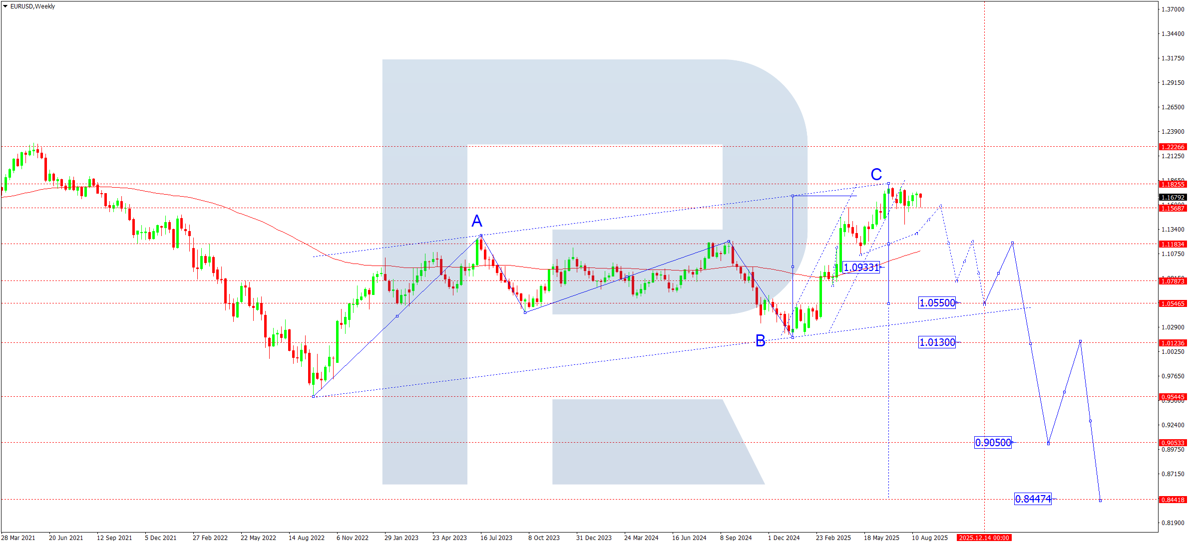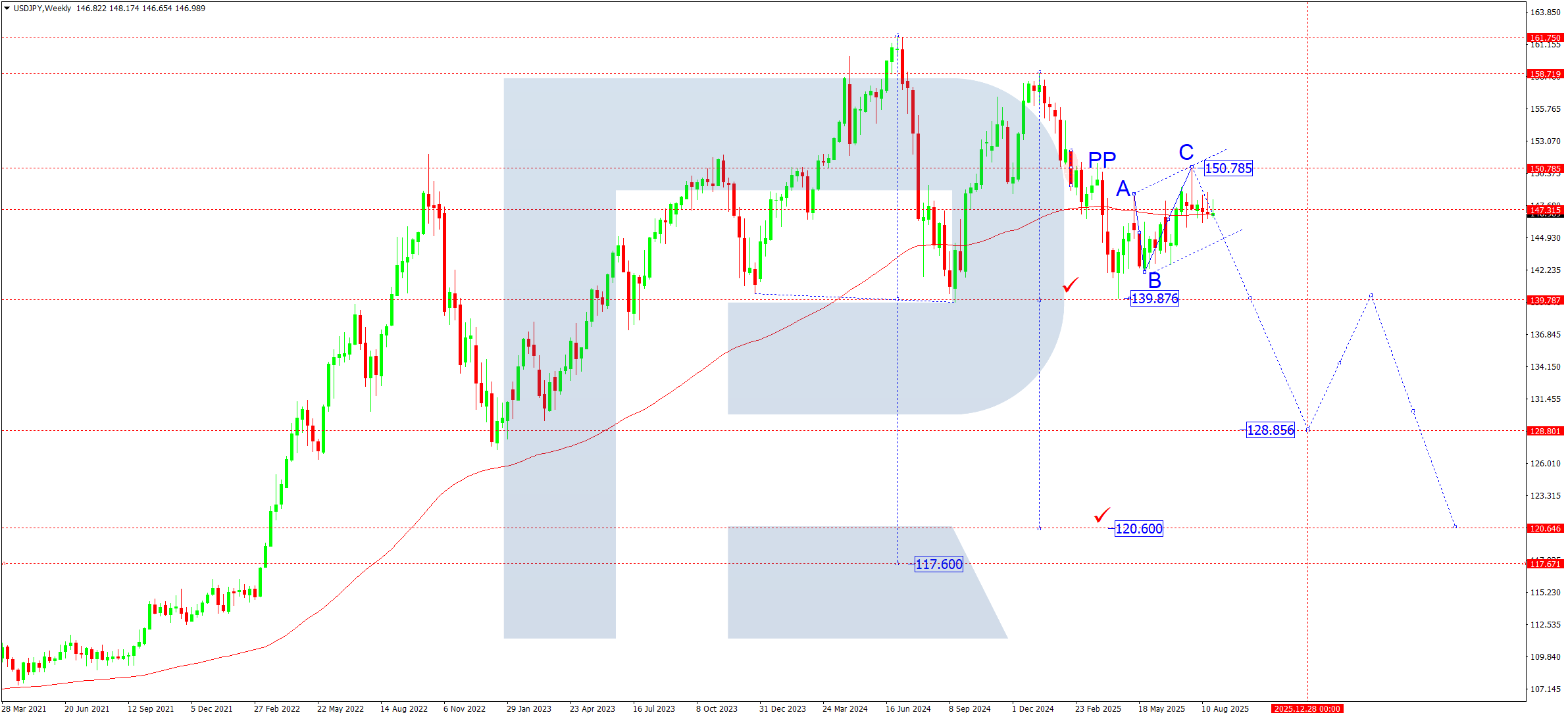 Haftalik grafikda juftlik A–B–C tuzatishni yakunlab, 150.78 ga yetdi. Bozor pivot nuqtasini pastdan qayta sinovdan o‘tkazdi. C-to‘lqinning besh-to‘lqinli tuzilmasi to‘liq shakllandi, tuzatish esa “Flag” (Bayroq) ga o‘xshaydi. Endi bozor 145.00 darajasidan pastga yorilib, 139.87 tomon yangi pasayishni boshlashga tayyor ko‘rinadi, bu ayirish impulsining faqat birinchi yarmi sifatida ko‘riladi. Sentabrda 140.00 yaqinida tor konsolidatsiya shakllanishi mumkin. Pastga yorilish yil yakuniga borib 128.88 tomon harakatni faollashtiradi.