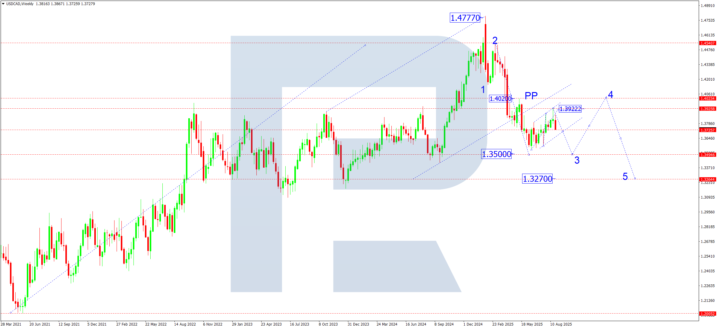 Haftalik grafikda USDCAD tuzatuvchi “Flag” (Bayroq) naqshini shakllantirdi. SMA50 narxni 1.3922 dan pastga itardi. Sentabrda juftlik 1.3720 ostiga yorilib, naqsh kanalidan chiqishi va ayirish impulsini kuchaytirishi kutiladi. 1.3720 dan pastga yorilish 1.3500 tomon lokal maqsad sifatida pasayish salohiyatini ochadi. Ushbu darajaga yetgach, 1.4020 (4-to‘lqin) hududiga tuzatish qaytishi mumkin. Shu ssenariyda keyingi bosqichda 1.3270 atrofida maqsadli beshinchi pastga to‘lqin rivojlanishi ehtimoli bor.