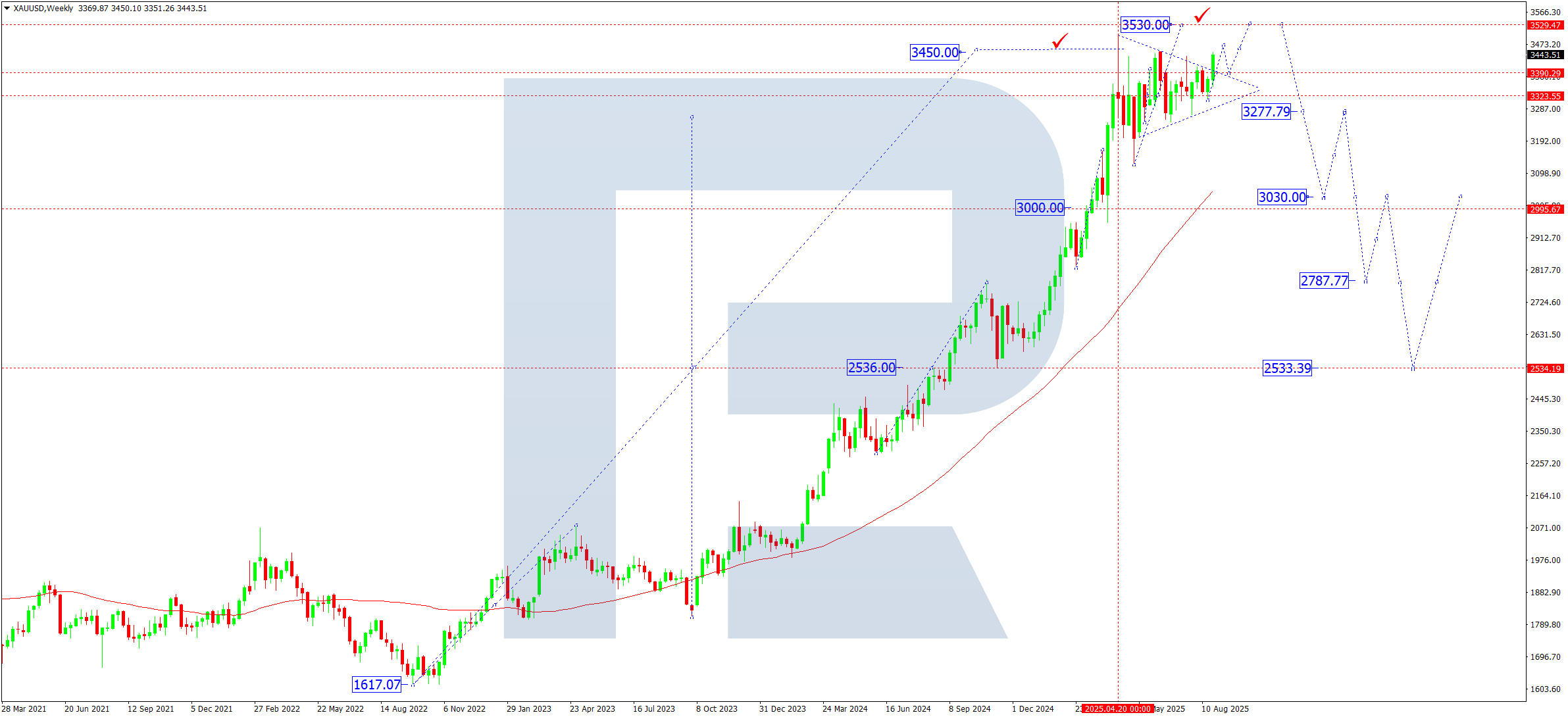 Haftalik grafikda bozor impulsiv rallyni yakunlab, “Pennant” naqshini yuqoriga yorib o‘tdi. Joriy o‘sish maqsadi 3,530 darajasida bo‘lib, bu amaldagi to‘lqin tuzilmasining cho‘qqisi va muhim qarshilik darajasiga to‘g‘ri keladi. 3,500–3,530 zonasi sinovidan so‘ng chuqurroq tuzatish ehtimoli yuqori, pasayishning potentsial maqsadi 3,030 (asosiy matritsa darajasi va psixologik qo‘llab-quvvatlash). Agar pastga yorilsa, pasayish 2,780–2,530 gacha kengayishi mumkin, bu uzoq muddatli qo‘llab-quvvatlash zonasi trendni barqarorlashtirishi ehtimoliga ega.