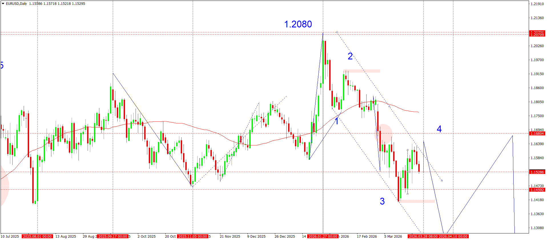 Kundalik grafikda EURUSD juftligi 1.2080 hududida mahalliy maksimum shakllangandan so‘ng pasayuvchi tuzilmani saqlab qolmoqda, bu joriy o‘rta muddatli siklning asosiy cho‘qqisi sifatida xizmat qiladi. Impulsiv o‘sish to‘lqini yakunlangach, narx korreksion bosqichga o‘tdi va 2–3 tuzilmasi sifatida belgilangan pasayuvchi kanalni shakllantirdi.