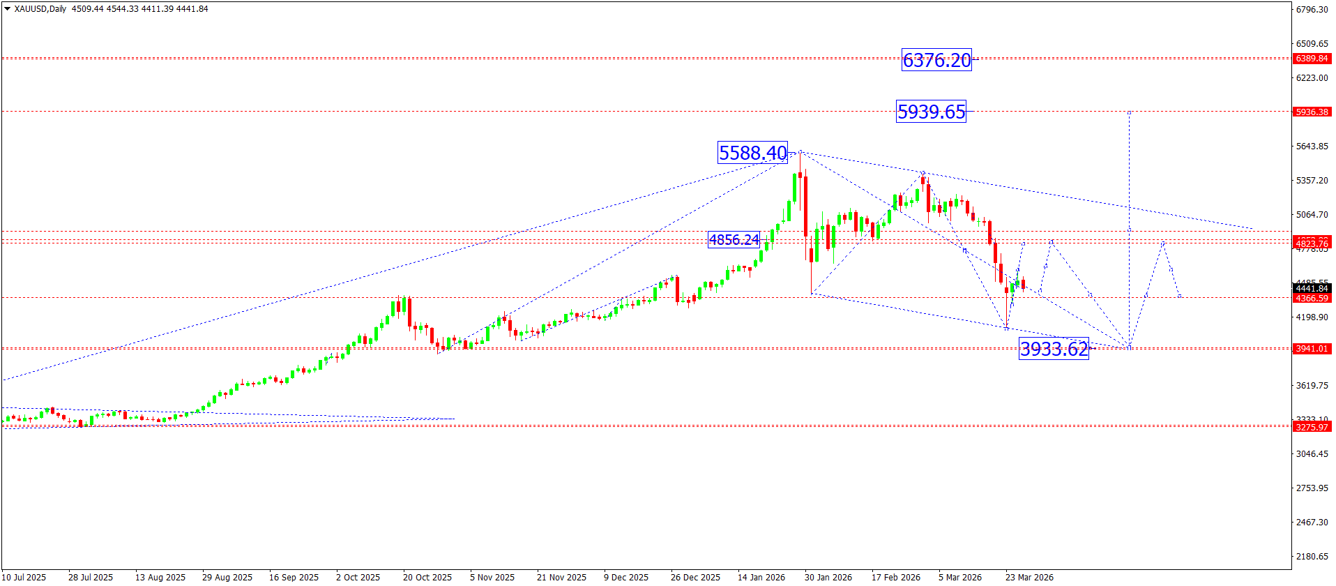 Kundalik grafikda XAUUSD o‘rta muddatli o‘sish trendi tuzilmasini saqlab qolmoqda, biroq 5,588 yaqinidagi mahalliy maksimumdan so‘ng korreksiya bosqichi boshlangan. Pasayish harakati impulsiv o‘sishdan keyingi korreksion to‘lqin sifatida pasayuvchi kanal ichida rivojlanmoqda.