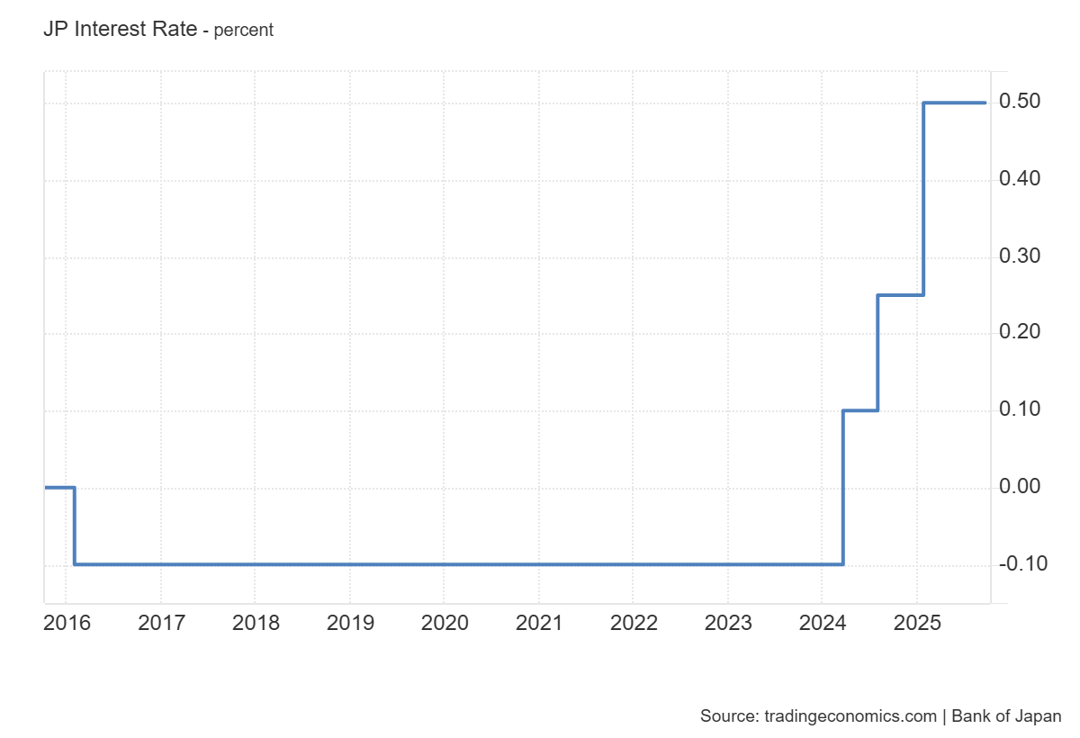 Yaponiya Markaziy banki asosiy foiz stavkasini prognozlarga mos ravishda 0.50% darajasida qoldirdi. Bu qaror korporatsiyalar uchun kapital xarajatlarini sezilarli oshirishi mumkin bo‘lgan qo‘shimcha qat’iylashtirishsiz monetar sharoitlarning ehtiyotkorona normallashishini bildiradi. Qisqa muddatli noaniqlik kamayadi va Yaponiya aksiyalari uchun risk mukofoti umuman olganda barqaror qoladi.