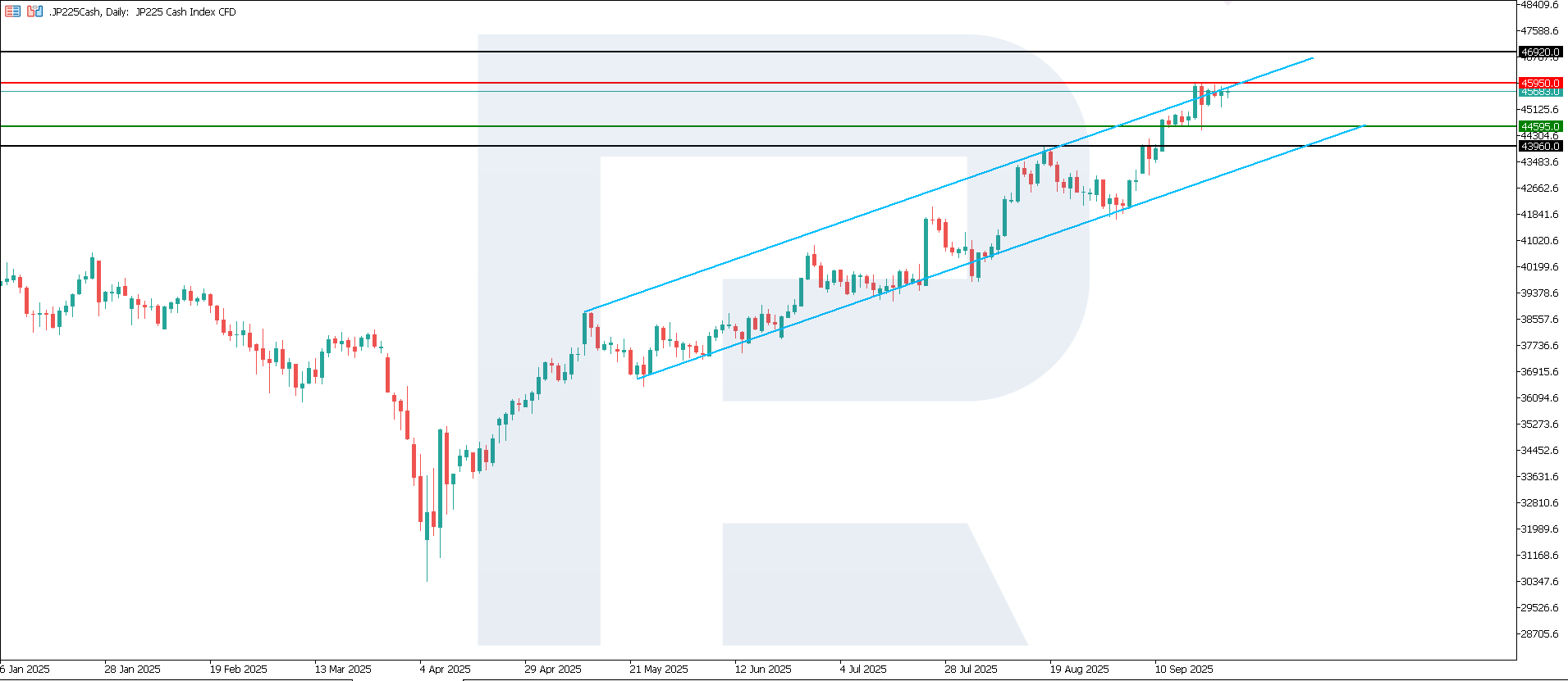 Yaponiya foiz stavkasi: https://tradingeconomics.com/japan/interest-rateJP 225 indeksi o‘sishni davom ettirdi va yangi rekord darajaga chiqdi. Qo‘llab-quvvatlash darajasi 44,595.0 da joylashgan, qarshilik darajasi esa 45,950.0 da. Hozirgi paytda trendning yuqoriga davom etish ehtimoli yuqori.