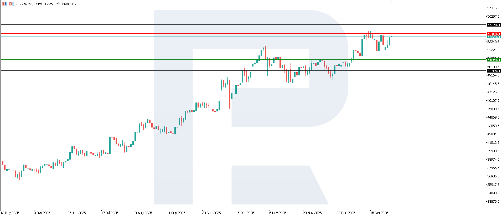 O‘sish va inflyatsiya prognozlarining yuqoriga qayta ko‘rib chiqilishi hamda kelgusida foiz stavkalarining oshirilish ehtimoliga oid yangi signal fonida, Yaponiya fond bozori va JP 225 indeksiga ta’sir qisqa muddatda neytral holatdan o‘rtacha cheklovchi tomonga siljimoqda. Bu, asosan, yuqoriroq foiz stavkalari kutilmalari va iyenaning mustahkamlanish xavfi orqali namoyon bo‘ladi. Indeksning barqarorligi valyuta bozoridagi keyingi reaksiyaning ko‘lami va monetar siyosatni qat’iylashtirish sur’atiga bog‘liq bo‘ladi. JP 225 uchun navbatdagi yuqoriga yo‘naltirilgan maqsad 55,270.0 darajasi bo‘lishi mumkin.