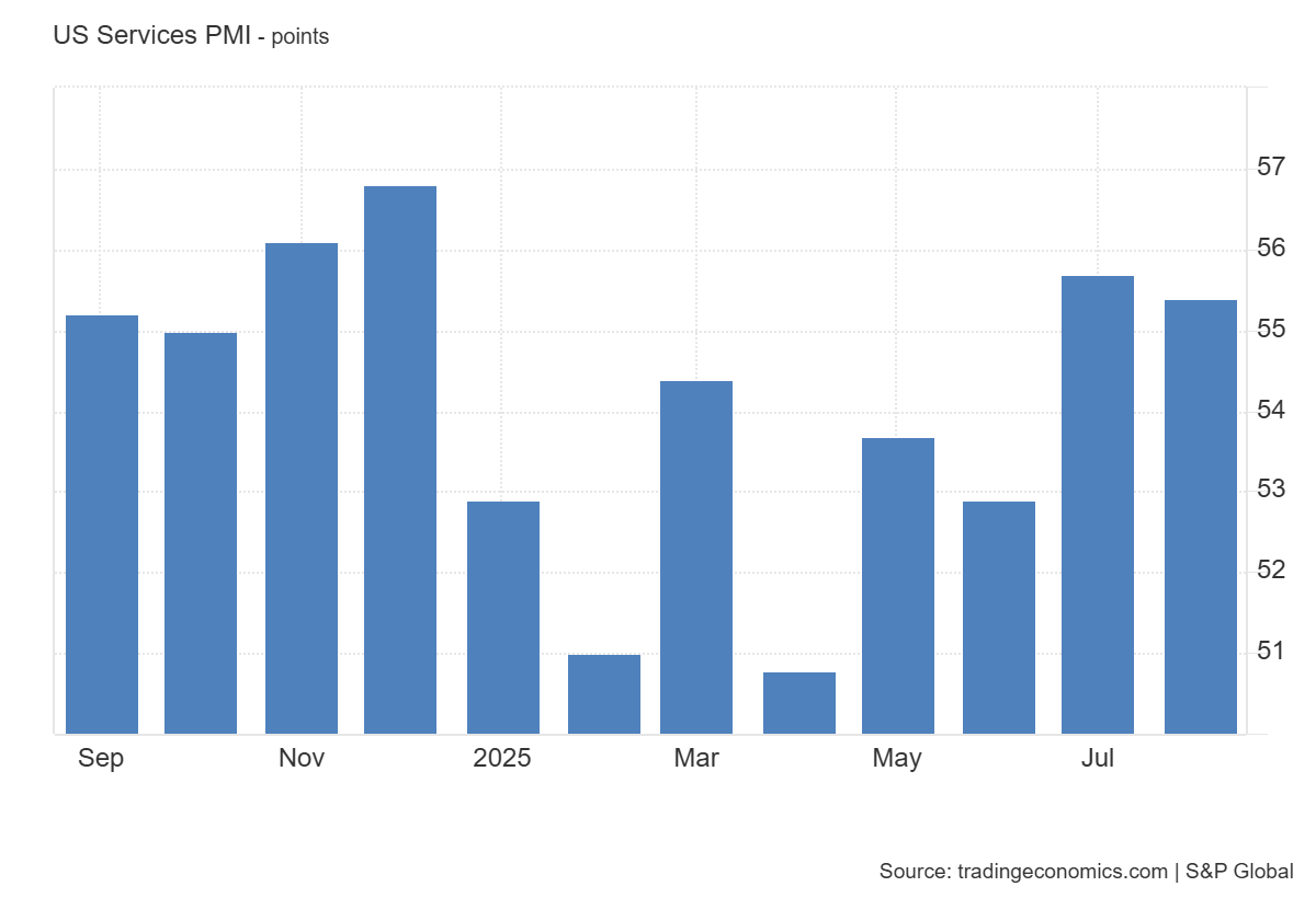 E’lon qilingan xizmatlar PMI 2025-yil iyul oyida 55.4 punktni tashkil etdi, prognoz (54.2) dan yuqori, biroq avvalgi ko‘rsatkich (55.7) dan pastroq. Ushbu ko‘rsatkich xizmatlar sektorining barqaror o‘sishini anglatadi, chunki u 50 punktlik asosiy chegaradan yuqori bo‘lib, kengayish va qisqarishni ajratadi. Xizmatlar sektori AQSh YaIMining uchdan ikki qismidan ortig‘ini tashkil etgani uchun uning barqarorligi butun iqtisodiyotning ijobiy dinamikasidan dalolat beradi.