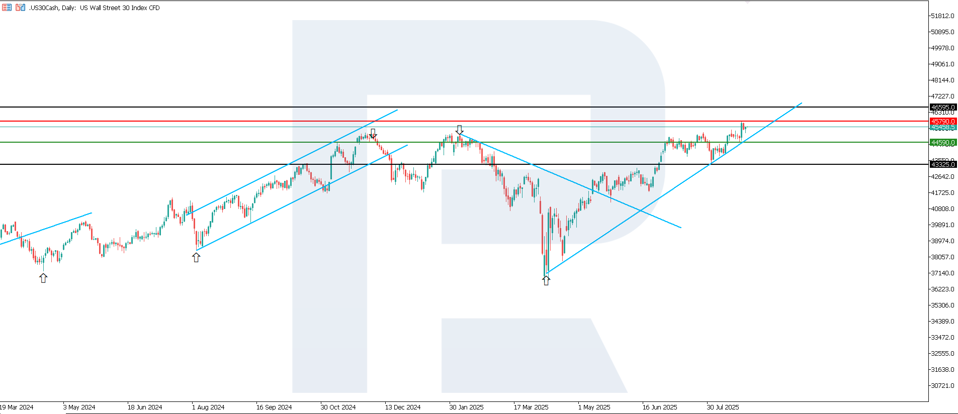 PMI ma’lumotlari qisqa muddatda fond bozoriga va US 30 indeksiga umuman ijobiy ta’sir ko‘rsatmoqda, biroq investorlar Fed siyosati va uning inflyatsiya dinamikasiga munosabatini diqqat bilan kuzatmoqda. Moliyaviy sektor barqaror iqtisodiy faollikdan foyda ko‘radi, chunki bu kreditlash va investitsiya jarayonlarini qo‘llab-quvvatlaydi. Texnologiya va aloqa kompaniyalari ham xizmatlar o‘sishidan bilvosita yutadi, chunki bu raqamli yechimlar va onlayn platformalarga talabni oshiradi. Indeks uchun keyingi o‘sish maqsadi 46,595.0 bo‘lishi mumkin.