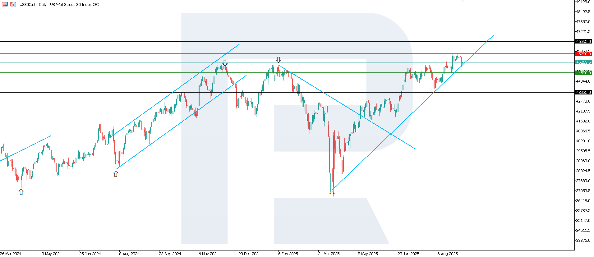 AQSh fond bozori uchun bunday ma’lumotlar investorlarning ehtiyotkorligini ko‘rsatmoqda. Ishlab chiqarish faolligining pasayishi iqtisodiyot holati bo‘yicha xavotirlarni kuchaytirishi mumkin, ayniqsa sanoat va eksport segmentlarida. Shu bilan birga, zaif ko‘rsatkichlar Federal Reserve tomonidan ko‘proq yumshoq choralar ko‘rilishi ehtimolini oshiradi, bu esa moliya bozorlarini umumiy qo‘llab-quvvatlashi mumkin. US 30 uchun keyingi yuqoriga maqsad 46,595.0 bo‘lishi mumkin.
