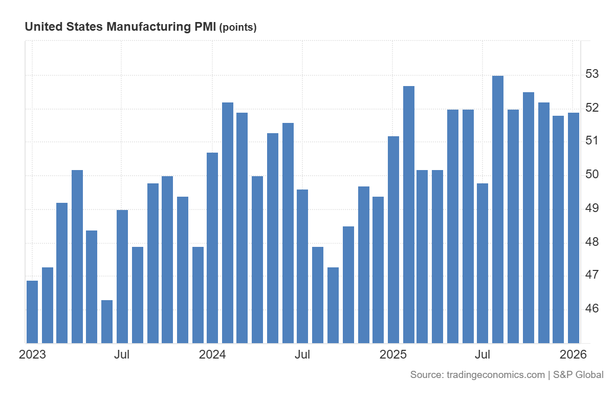 Ishlab chiqarish PMI indeksi ishlab chiqarish sektoridagi biznes faolligi kengayib borayotganini yoki qisqarayotganini ko‘rsatadi. 50.0 darajadan yuqori ko‘rsatkich o‘sishni, 50.0 dan past ko‘rsatkich esa qisqarishni anglatadi. So‘nggi e’lon qilingan ma’lumotlarga ko‘ra, indikator 51.9 darajasida qayd etildi, bu prognoz (51.9) bilan to‘liq mos va avvalgi 51.8 ko‘rsatkichidan biroz yuqori. Bu ishlab chiqarish sektori mo‘tadil o‘sish zonasida qolayotganini va dinamikada kichik yaxshilanish mavjudligini anglatadi, biroq bozor uchun kutilmagan holat bo‘lmadi.