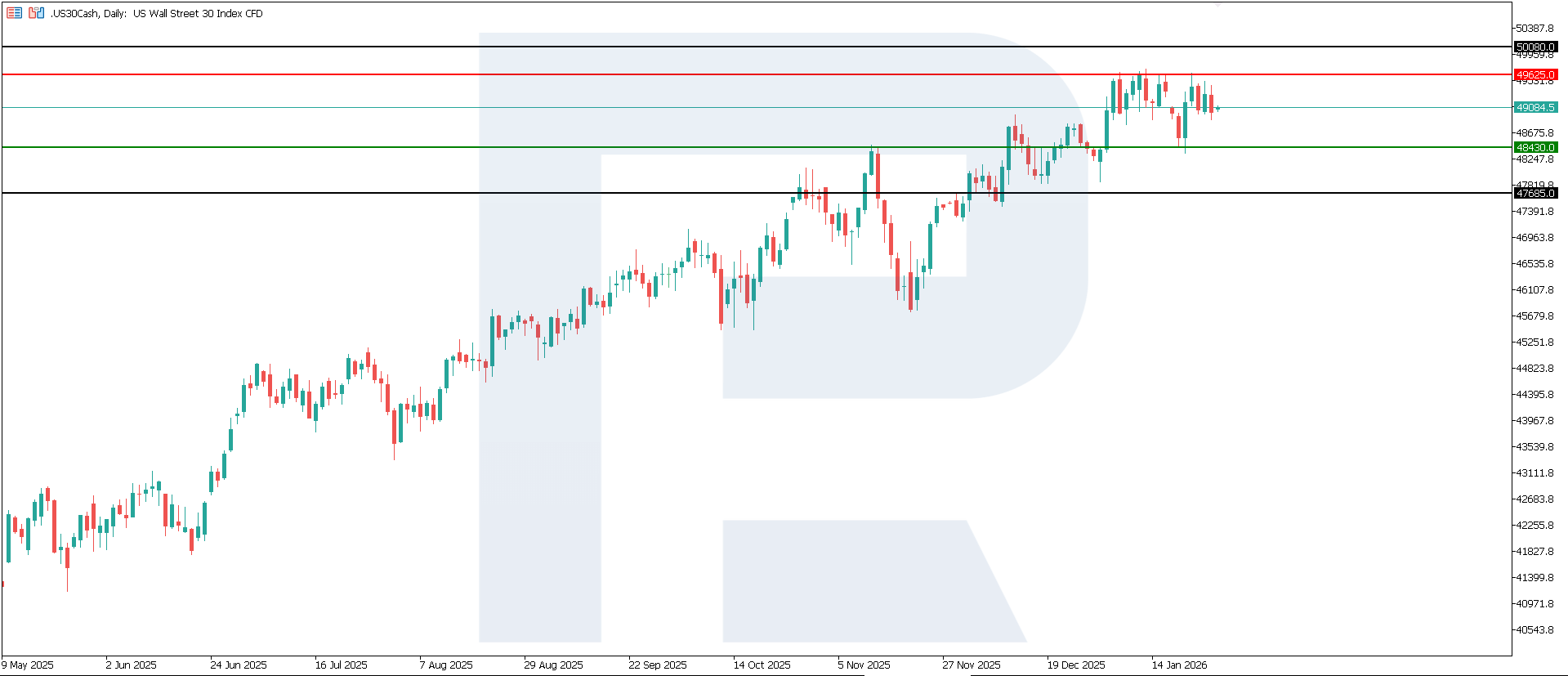US 30 bo‘yicha tuzatish harakati pasayishga, so‘ngra yonma-yon trendga aylandi. Bugungi US 30 prognozi — salbiy.