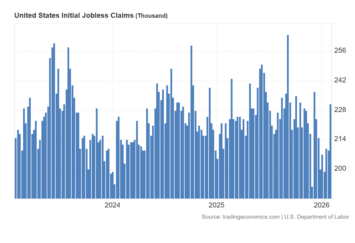 AQShda dastlabki ishsizlik bo‘yicha arizalar e’lon qilinishi (231 ming, prognoz — 212 ming, avvalgi hafta — 209 ming) US 500 indeksi uchun qisqa muddatda mo‘tadil salbiy signal beradi, chunki bu mehnat bozori kutilganidan ko‘ra sezilarliroq sovuqlashayotganini ko‘rsatadi. Shu bilan birga, ko‘lamni ham inobatga olish muhim: arizalar soni inqiroz darajalaridan ancha past va tarixiy jihatdan odatiy diapazonga yaqin. Shuning uchun bu keskin iqtisodiy yomonlashuv belgisi emas, balki bosqichma-bosqich sekinlashuv signali sifatida baholanadi.