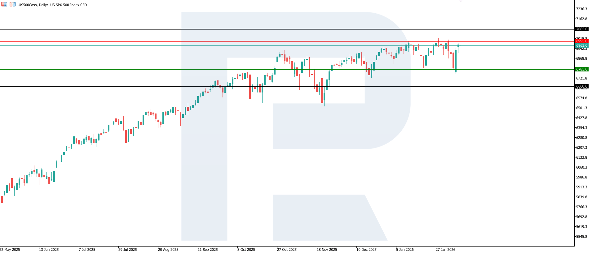 US 500 indeksi uchun ushbu statistik ma’lumotlar qisqa muddatli volatillikning oshishi va investorlar xatti-harakatlarida sektorlar bo‘yicha farqlanish kuchayishini ko‘rsatmoqda. Mehnat bozori va inflyatsiya bo‘yicha keyingi e’lonlar aniqlangan impulsning barqarorligini tasdiqlashi yoki rad etishi jihatidan hal qiluvchi ahamiyatga ega bo‘ladi. Texnik nuqtai nazardan, US 500 indeksi 7,085.0 darajasigacha ko‘tarilishi mumkin.