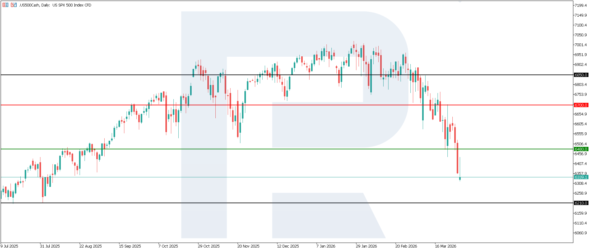 Joriy darajalarda US 500 geopolitik shoklarga tarixiy reaksiyalardan biroz ko‘proq pasaydi, narxlar taxminan uch hafta ichida 6–8% ga tushdi. US 500 6,700.0 atrofida qarshilik darajasini shakllantirdi, 6,480.0 atrofidagi asosiy qo‘llab-quvvatlash esa buzildi. Agar pasayish davom etsa, keyingi maqsad 6,210.0 bo‘lishi mumkin.