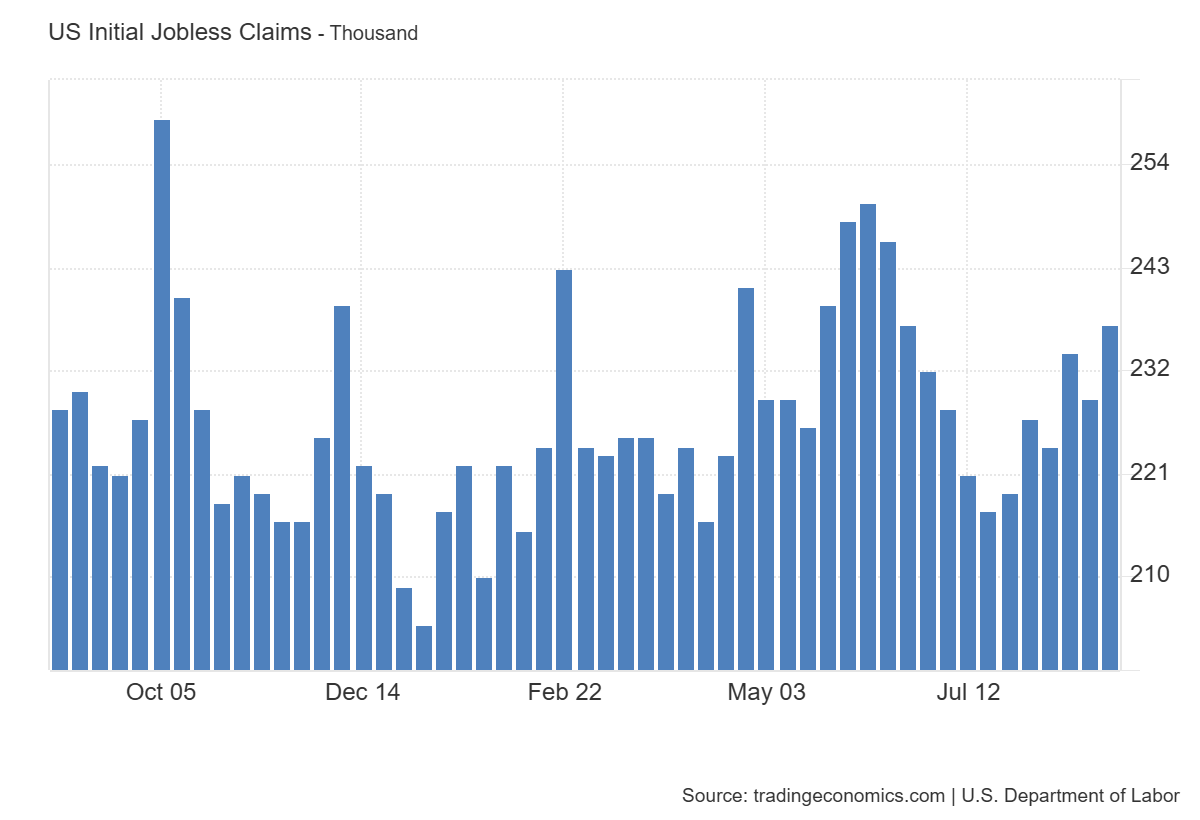 AQShda boshlang‘ich ishsizlik nafaqasi da’volari prognoz qilingan 230 ming va avvalgi 229 mingga nisbatan 237 mingni tashkil qildi. Ko‘rsatkich kutilganidan biroz yuqoriroq chiqdi va mehnat bozorining asta-sekin yumshab borayotganini tasdiqladi: ishdan bo‘shatishlar ko‘paymoqda, bandlik sur’ati pasaymoqda. Ko‘rsatkichning o‘zi inqiroz darajasidan uzoq bo‘lsa-da, trend iqtisodiyotning ortiqcha qizib ketishi kamayganini va ish haqi bilan bog‘liq inflyatsion bosim sustlashganini ko‘rsatmoqda.