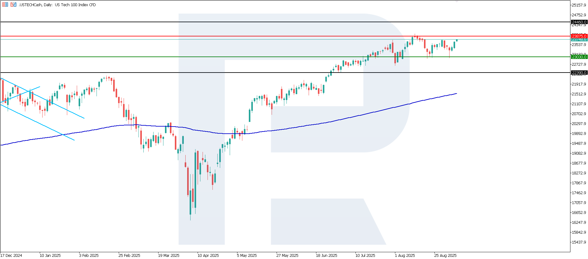 2025 yil 5 sentabr uchun US Tech texnik tahliliUS Tech indeksi avvalgi 23,465.0 qo‘llab-quvvatlash darajasidan pastga tushdi va yangi qo‘llab-quvvatlash chizig‘i 23,030.0 da shakllandi. Qarshilik 23,875.0 da joylashgan. Pasayish trendi yakuniga yaqinlashmoqda va narx qarshilik darajasidan yuqoriga chiqishi ehtimoli bor, keyingi maqsad 24,460.0 bo‘ladi.