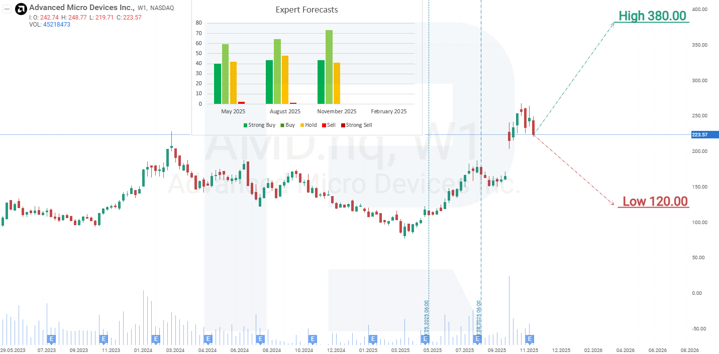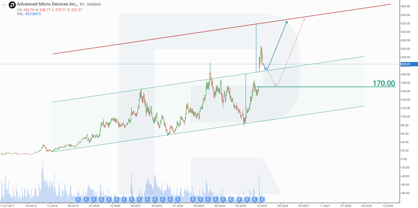 Haftalik grafikda Advanced Micro Devices aksiyalari 2025-yil oktabrigacha o‘suvchi kanal ichida savdo qilindi. 2025-yil 6-oktabr kuni AMD va OpenAI o‘rtasida AI chiplarini yetkazib berish bo‘yicha yirik kelishuv imzolanishi, shuningdek OpenAI’ga kompaniya aksiyalarining 10% gacha ulushini sotib olish opsionining berilishi AMD aksiyalarida keskin ralliga sabab bo‘ldi; natijada narx o‘suvchi kanalning yuqori chegarasidan yuqoriga chiqib ketdi. AMD aksiyalarining hozirgi dinamikasiga asoslanib, 2025-yil uchun ehtimoliy stsenariylar quyidagicha: