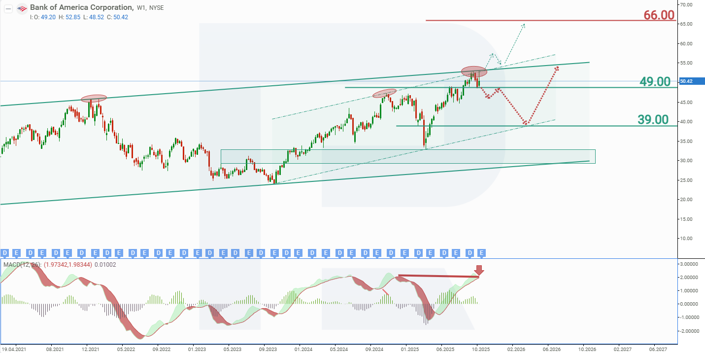 Haftalik grafikda Bank of America Corporation aksiyalari o‘suvchi kanal ichida savdo qilmoqda va hozir kanalning yuqori chegarasiga yetgan, bu esa qarshilik sifatida harakat qilmoqda. Bundan tashqari, MACD indikatorida divergensiya shakllangan bo‘lib, bu narx pasayishini bildirishi mumkin. Hozirgi BAC aksiyalari harakatlariga asoslanib, 2025-yil uchun kutilayotgan narx o‘zgarishlari quyidagicha: