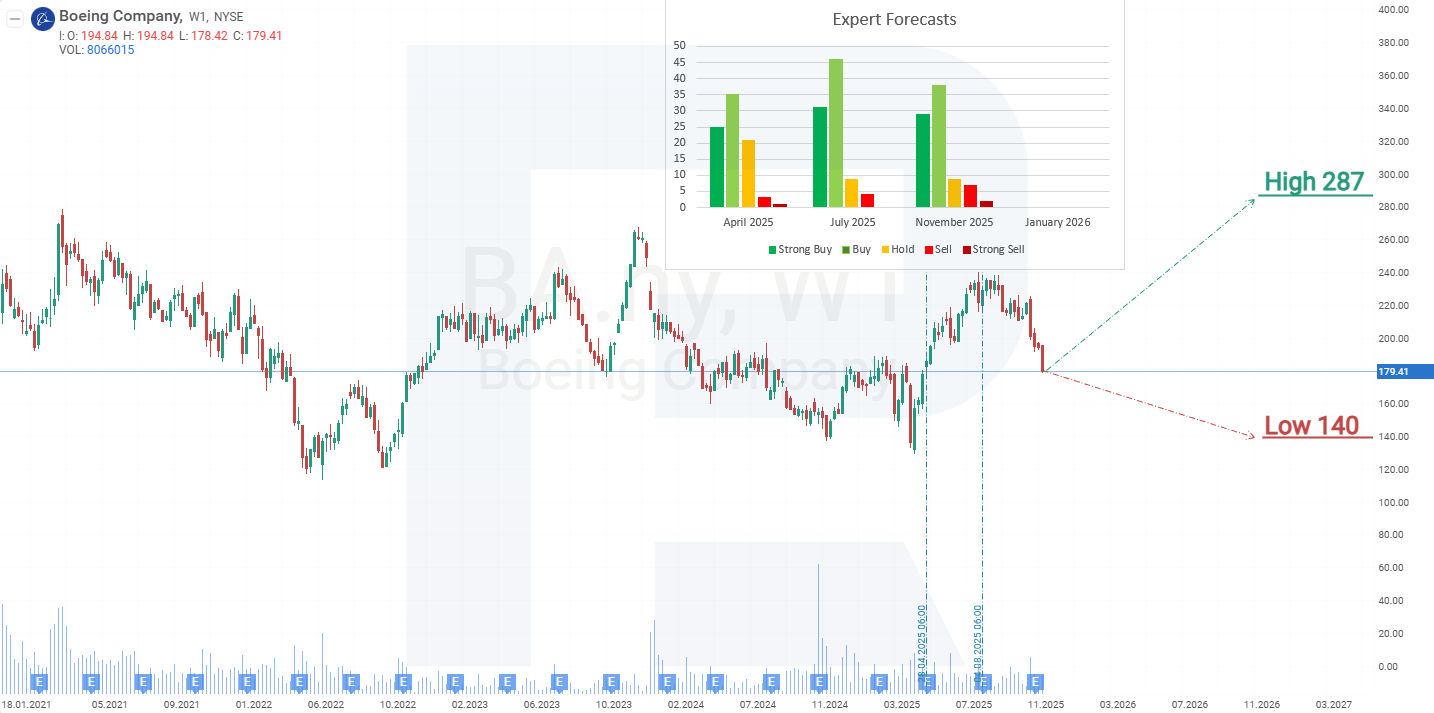2025 yil 2-chorak hisobotidan so‘ng Boeing aksiyalarining narxi keskin pasaydi va keyingi hisobot investorlar pessimizmini yanada kuchaytirdi. Boeing’ning tiklanishi kutilganidan ancha sekin bormoqda, rahbariyatning oldinda qiyin yillar kutayotgani haqidagi prognozi esa bozor xavotirlarini yanada mustahkamladi. Investorlar hozirgi darajalarda xatarni o‘z zimmalariga olib, aksiyalarni sotib olishga shoshilmayapti, balki Boeing’ning holati 2030 yilga kelib yaxshilanishini kutishni afzal ko‘rmoqda. Kompaniyaning qarz yuki yuqoriligicha qolmoqda va agar foiz stavkalari yuqori darajada saqlanib qolsa, qarz xizmatini ko‘rsatish xarajatlari erkin pul oqimiga bosim o‘tkazishda davom etadi va qarzni qisqartirish jarayonini yanada sekinlashtirishi mumkin. Natijada, yaqin muddatda Boeing aksiyalariga pastga yo‘naltirilgan bosim saqlanib qolishi mumkin. The Boeing Company aksiyalarining hozirgi dinamikasiga asoslanib, 2025 yil uchun ehtimoliy ssenariylar quyidagicha: