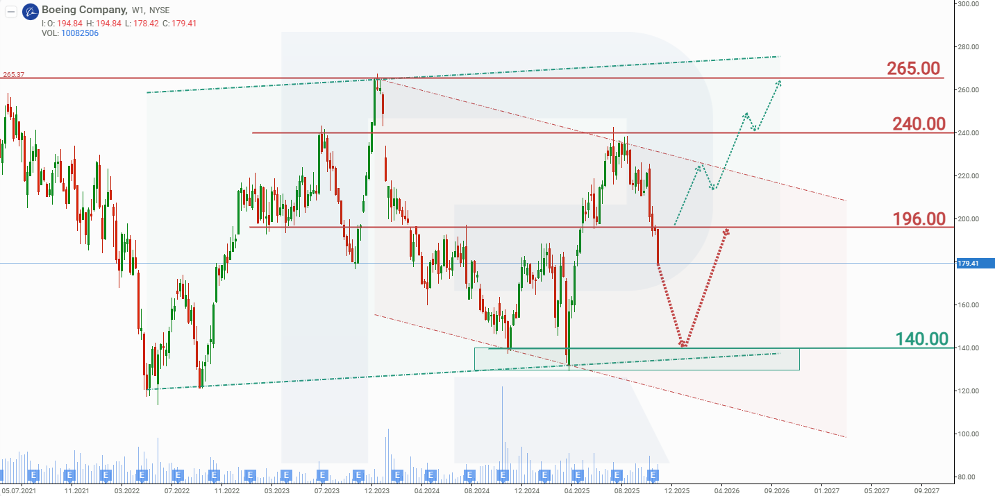 Boeing aksiyalari bo‘yicha alternativ prognoz kompaniyaga nisbatan investorlarning yanada optimistik kayfiyatini nazarda tutadi. Bu turli omillar bilan bog‘liq bo‘lishi mumkin – kengroq bozor optimizmigacha yoki Boeing ichidagi aniq ijobiy katalizatorlargacha, masalan, yirik yangi buyurtmalar, sertifikatlash va sifat bo‘yicha siljishlar yoki ishlab chiqarish sur’atlarining oshishi. Ushbu ssenariyda 240 dollarlik qarshilik darajasidan yuqoriga yorib o‘tish kuzatilishi, bu esa keyingi o‘sish uchun yo‘l ochishi mumkin.