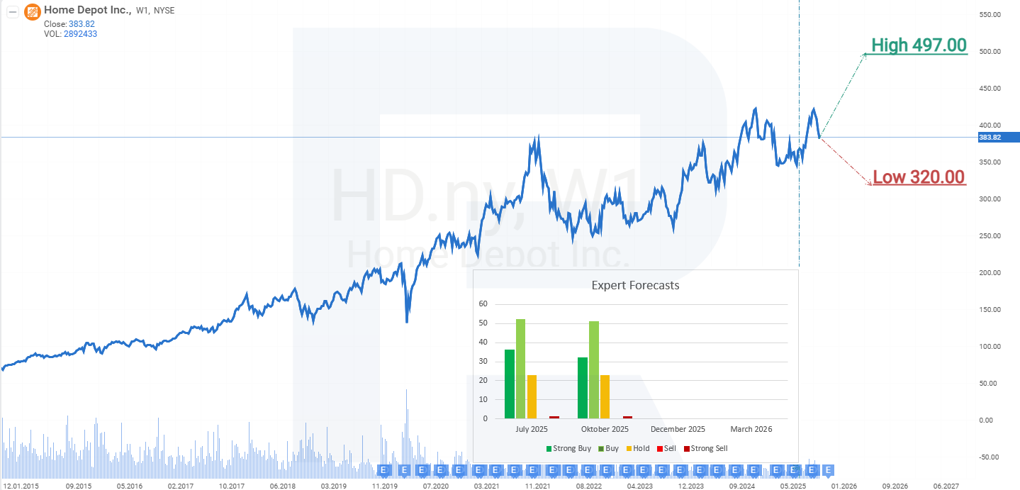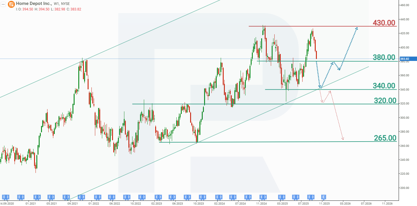 Choraklik hisobot e’lon qilinishi aksiyalar narxining yangi tarixiy cho‘qqiga chiqishiga yordam berdi. Biroq Federal zaxira tizimi foiz stavkasini pasaytirgach, investorlar portfellarida Home Depot aksiyalarini ushlab turish o‘rniga foydani fiksatsiya qilishni afzal ko‘rdilar, bu esa narxning pasayishiga olib keldi. Mehnat bozori bo‘yicha zaif ma’lumotlar bosimni yanada kuchaytirdi va hisobotdan keyin erishilgan deyarli barcha o‘sishlar yo‘qoldi. Hozirgi Home Depot aksiyalarining harakati asosida 2025 yil uchun HD narxi bo‘yicha ikki ssenariy ko‘rib chiqilishi mumkin: