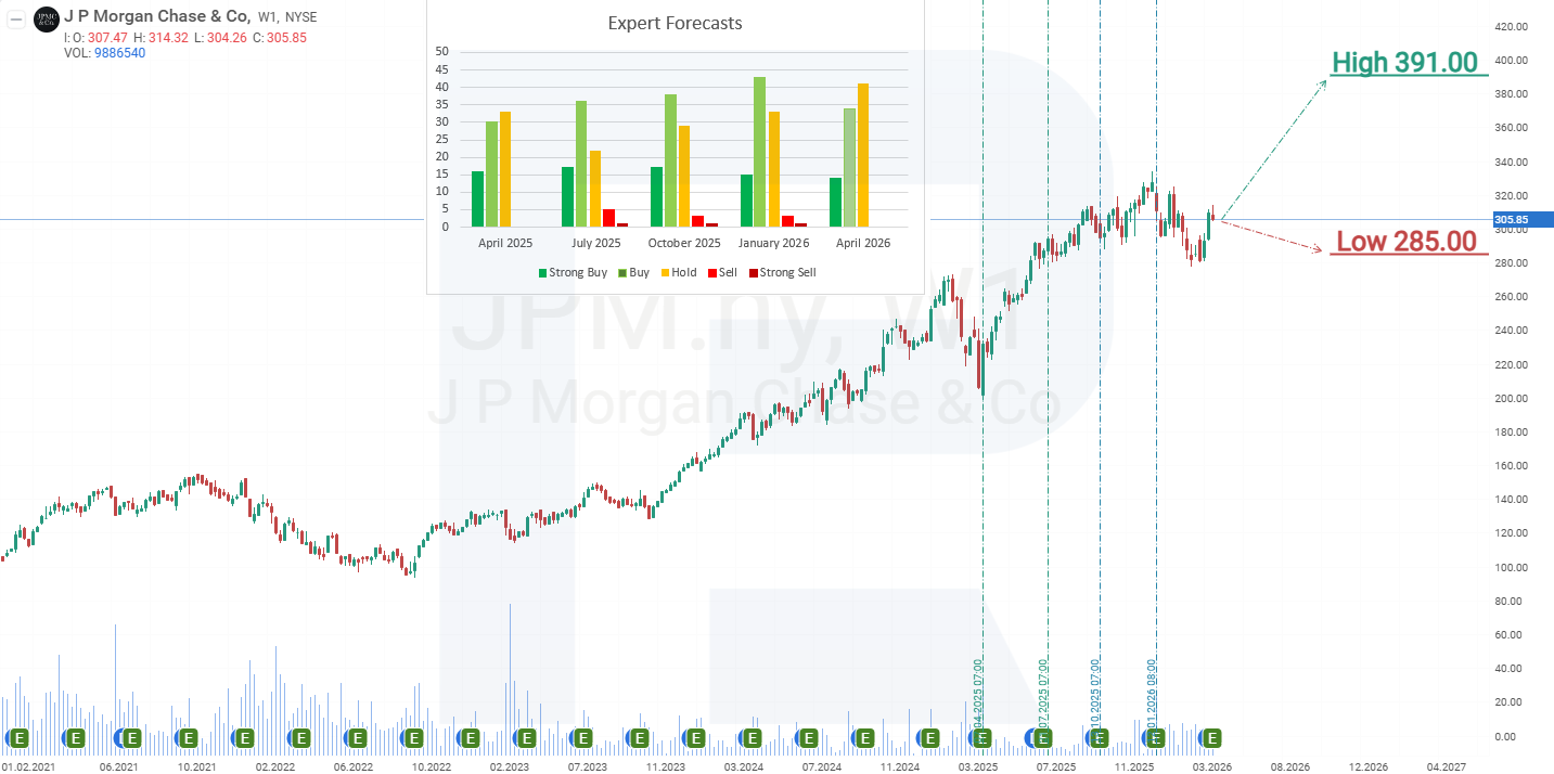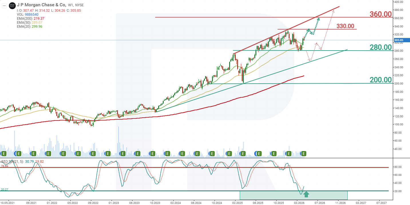 Haftalik grafikda JPMorgan aksiyalari ko‘tarilish trendida qolmoqda, chunki JPM o‘zining 200 kunlik harakatlanuvchi o‘rtachasidan yuqorida savdo qilinmoqda. Stochastic indicator haddan tashqari sotilgan hududdan chiqmoqda, bu esa yaqindagi korreksiya yakuniga yaqinlashgan bo‘lishi va kengroq ko‘tarilish trendi qayta tiklanishi mumkinligini bildiradi. JPMorgan Chase & Co. aksiyalarining joriy narx dinamikasi asosida 2026-yil uchun ehtimoliy narx ssenariylari quyidagicha: