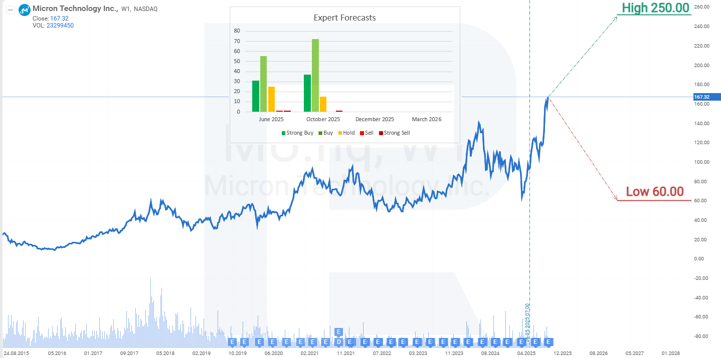 Aprel oyida Micron Technology NVIDIA (NASDAQ: NVDA) uchun HBM3E chiplarini ommaviy ishlab chiqarishni boshlagani e’lon qilingach, MU aksiyalari keskin oshdi. Apreldan 2025 yil oktabrigacha aksiyalar 160% ga o‘sdi, avvalgi 157 USD rekord darajasini buzdi va hozir 185 USD atrofidagi qarshilik chizig‘iga yaqinlashmoqda. Micron aksiyalarining joriy dinamikasiga asoslanib, 2025 yil uchun ikki asosiy ssenariy mavjud: