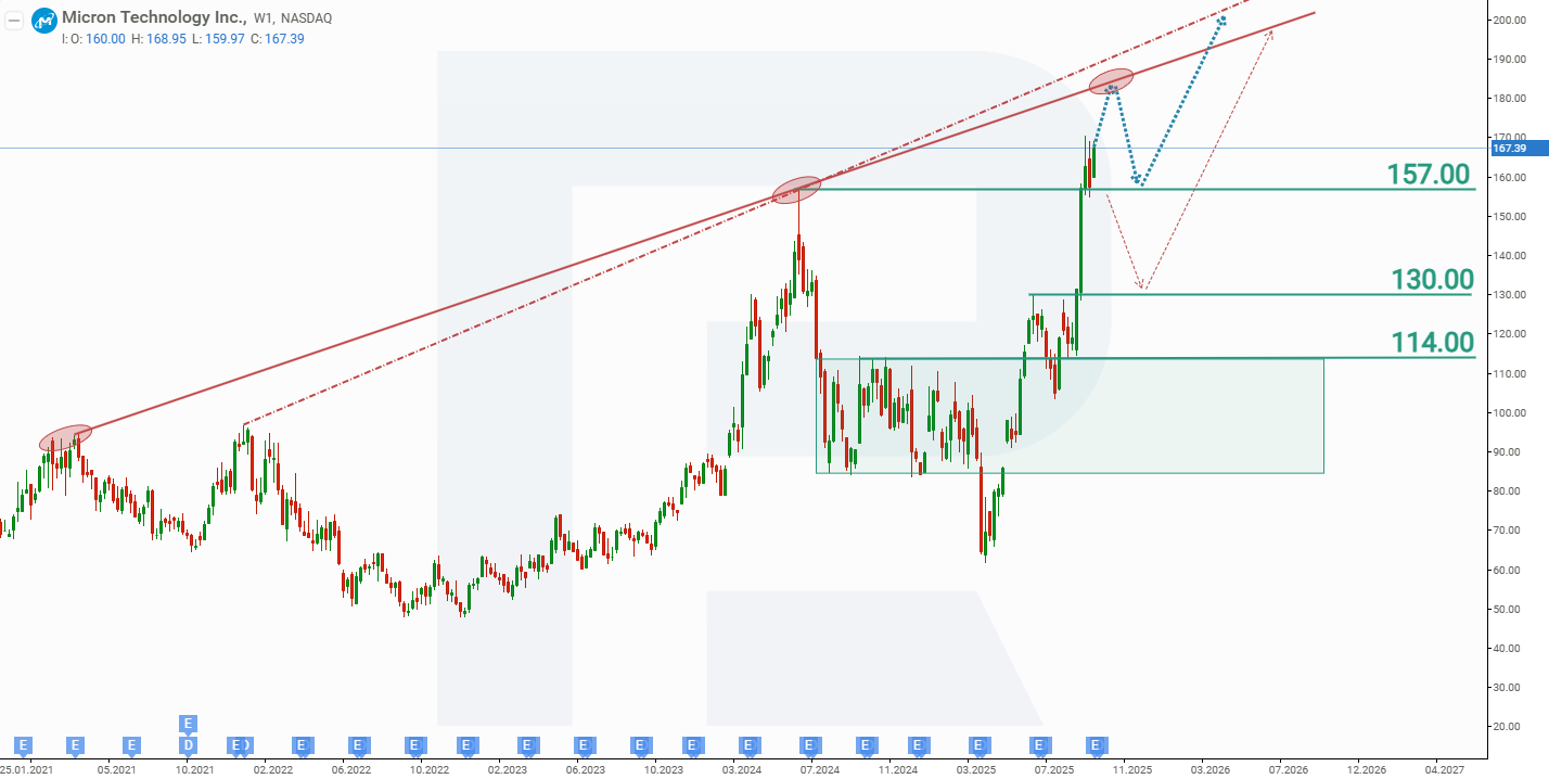 Micron aksiyalari bo‘yicha asosiy ssenariy (Base case forecast): bu taxminan 185 USD darajasidagi qarshilikni sinash, so‘ngra 157 USD darajasidagi qo‘llab-quvvatlashga qisqa muddatli tuzatish (pullback)ni nazarda tutadi. Bunday pasayish tuzatish sifatida ko‘riladi. 157 USD darajasidan qaytgach, MU aksiyalari o‘sish trendini davom ettirishi va 200 USD atrofidagi maqsadga yo‘nalishi mumkin.