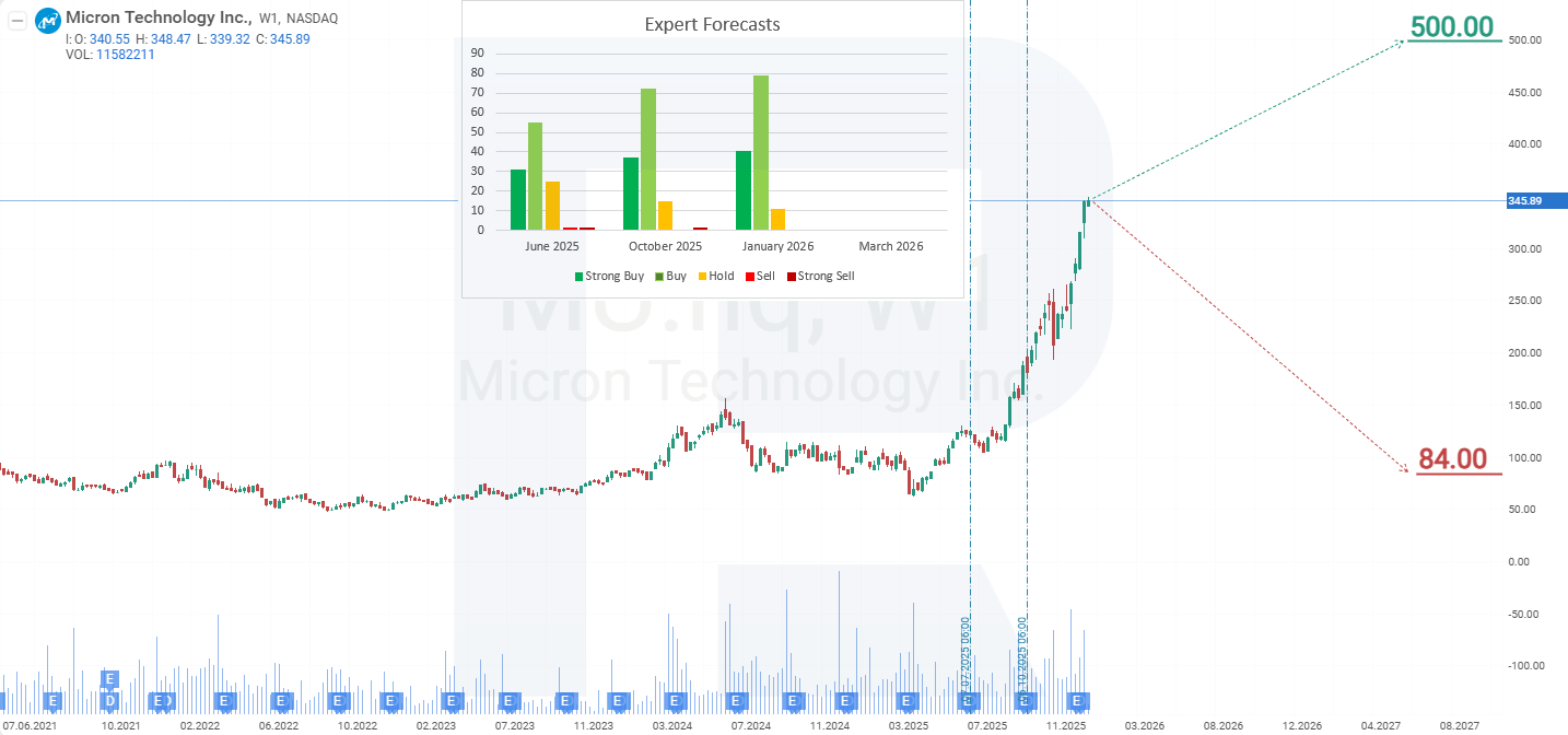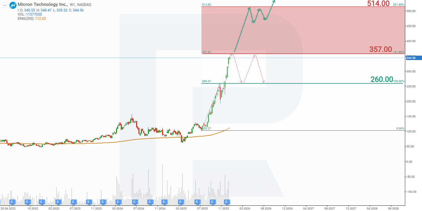 2025 yilning ikkinchi yarmida xotiraga bo‘lgan talab ortishi fonida investorlar e’tibori Micron Technology’ga ko‘chdi, bu esa aksiyalar narxini 230%dan ko‘proqqa oshirdi va uni 357 USDdagi qarshilikka yaqinlashtirdi. Micron aksiyalarining joriy dinamikasidan kelib chiqib, 2026 yil uchun ehtimoliy narx ssenariylari quyidagicha: