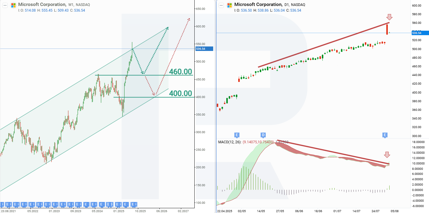 Microsoft aksiyalari uchun ekspert prognozlari 2025Haftalik grafikda Microsoft Corporation aksiyalari narxi ko‘tarilish kanalida savdolanmoqda va bu kanalning yuqori chegarasiga yetdi. Kundalik grafikda esa MACD indikatorida bearish divergence shakllangan, bu MSFT aksiyalari narxining pasayishi ehtimolini bildiradi. Joriy aksiyalar harakatlariga asoslanib, 2025 yil uchun MSFT narxi bo‘yicha mumkin bo‘lgan ssenariylar quyidagicha: